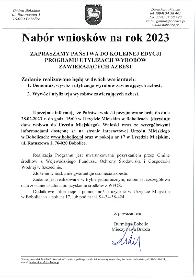 2019-11-06 Gmina Bobolice zawarła umowę z wykonawcą na realizację usługi usuwania azbestu w dniu 06.11.2019 r.