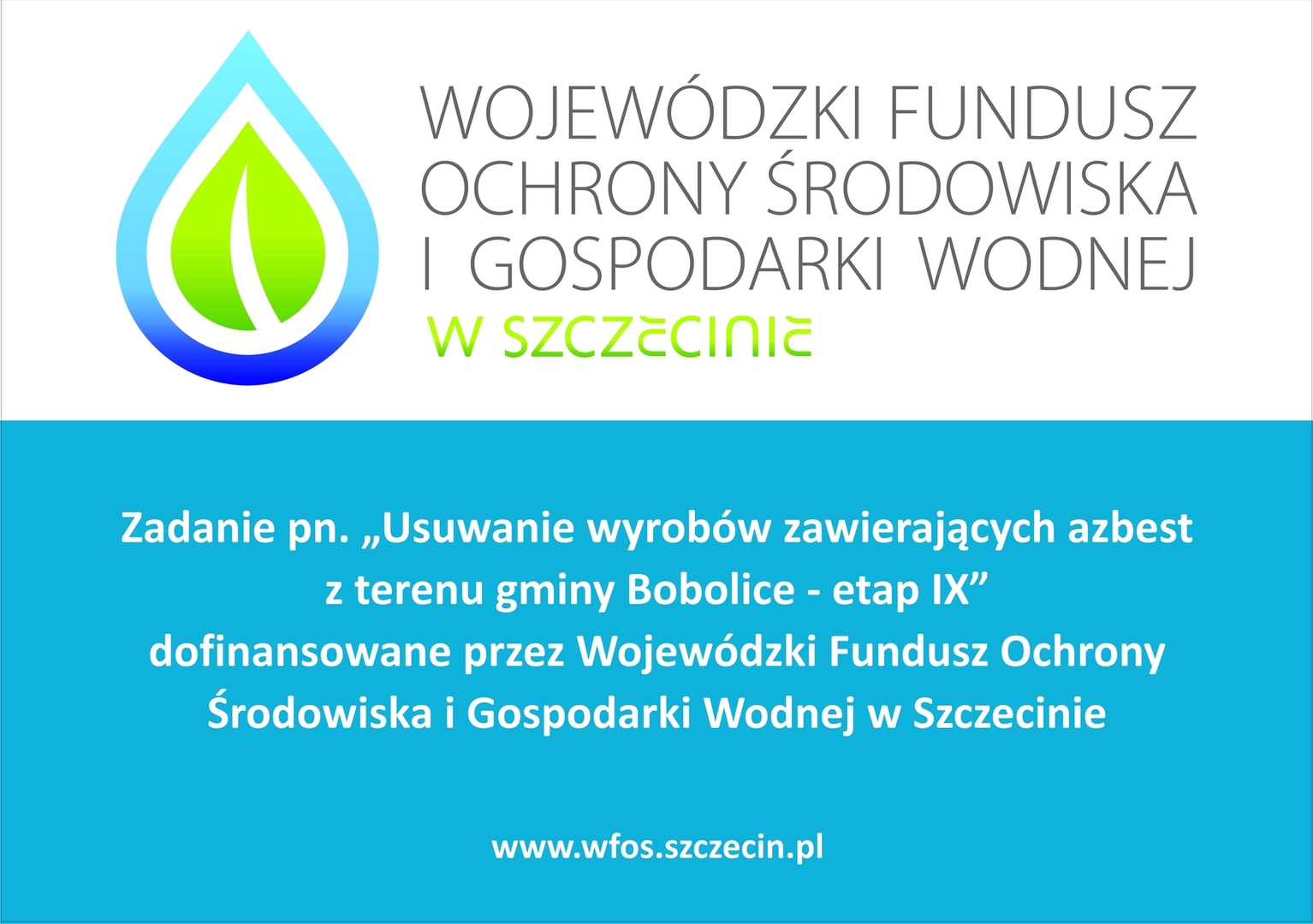 Gmina Bobolice informuje, że w 2020 roku uzyskała pomoc finansową na zadanie pn. „Usuwanie wyrobów zawierających azbest z terenu gminy Bobolice - etap IX”, która pochodzi w 50% ze środków Narodowego Funduszu Ochrony Środowiska i Gospodarki Wodnej w Warszawie oraz w 50% ze środków Wojewódzkiego Funduszu Ochrony Środowiska i Gospodarki Wodnej w Szczecinie.