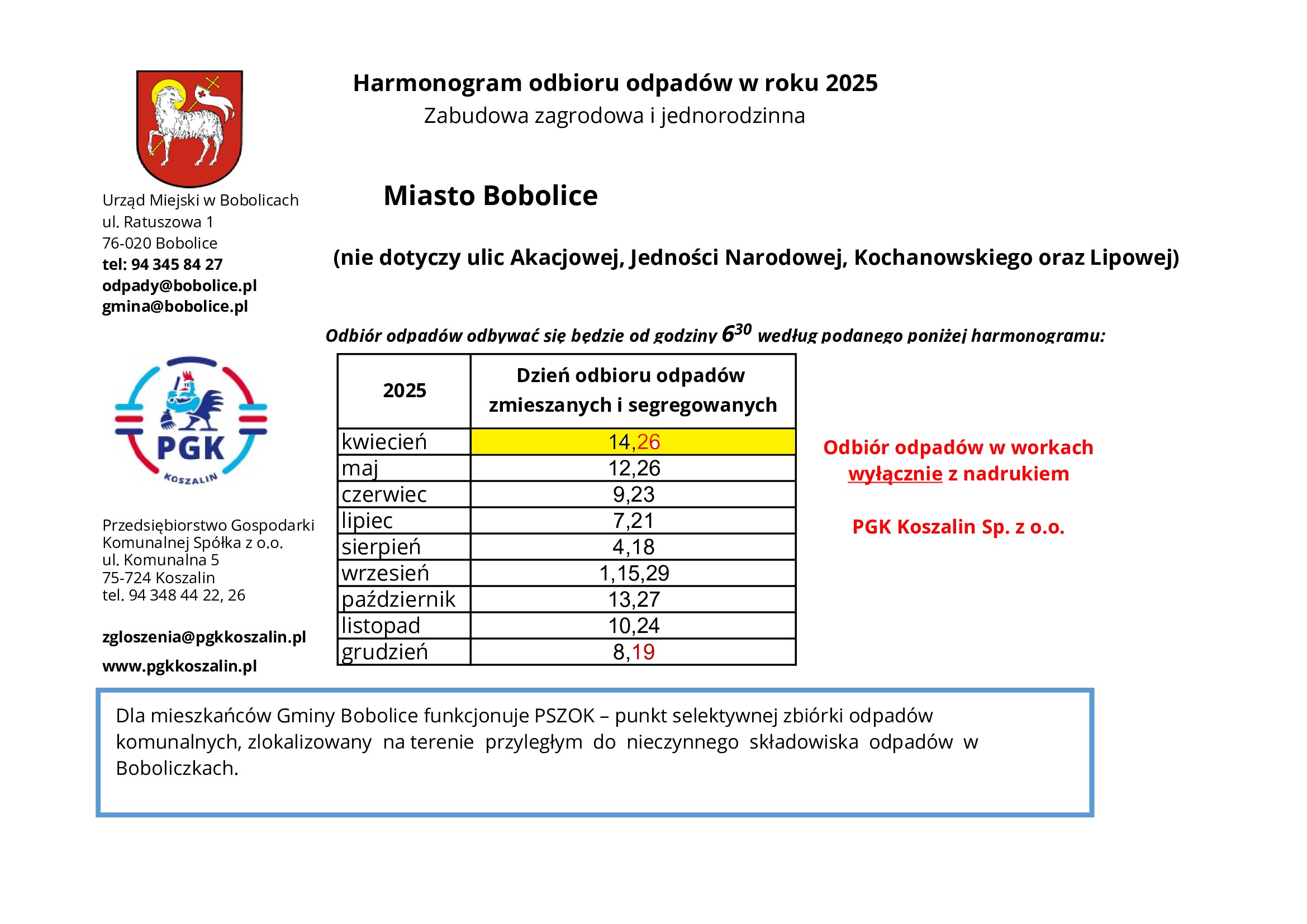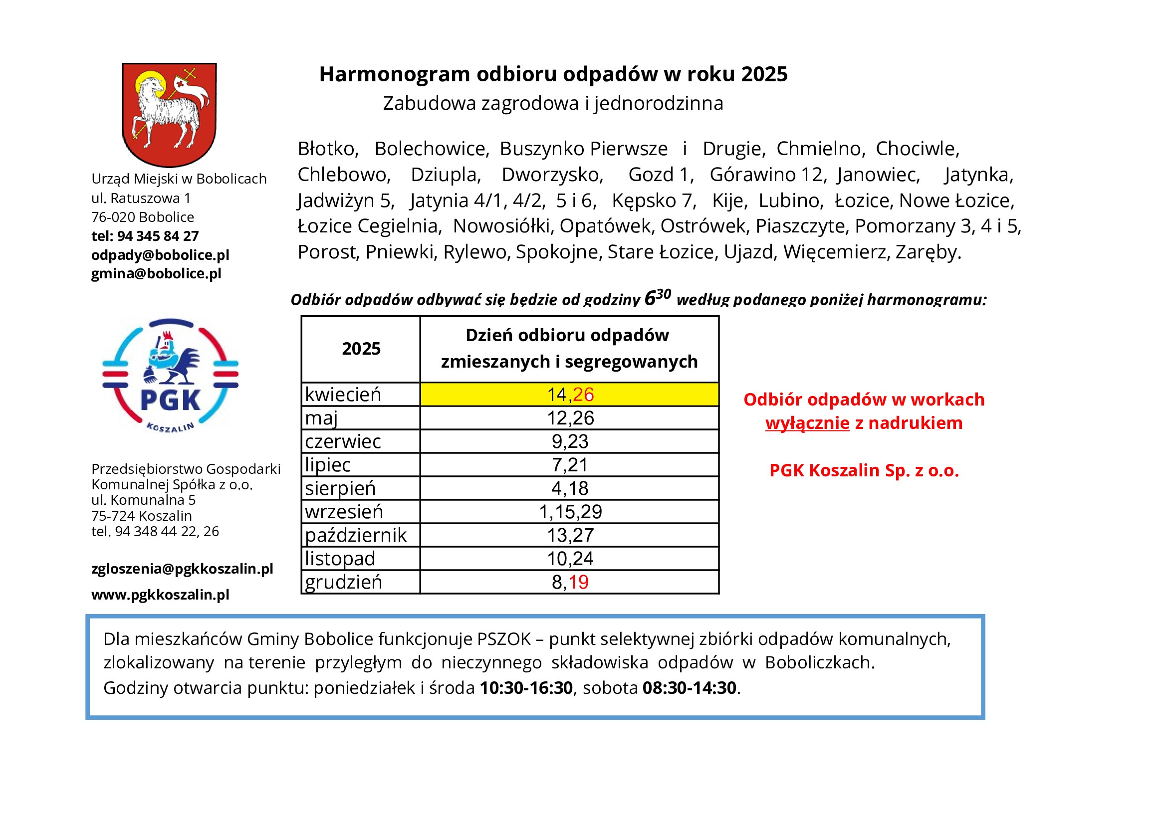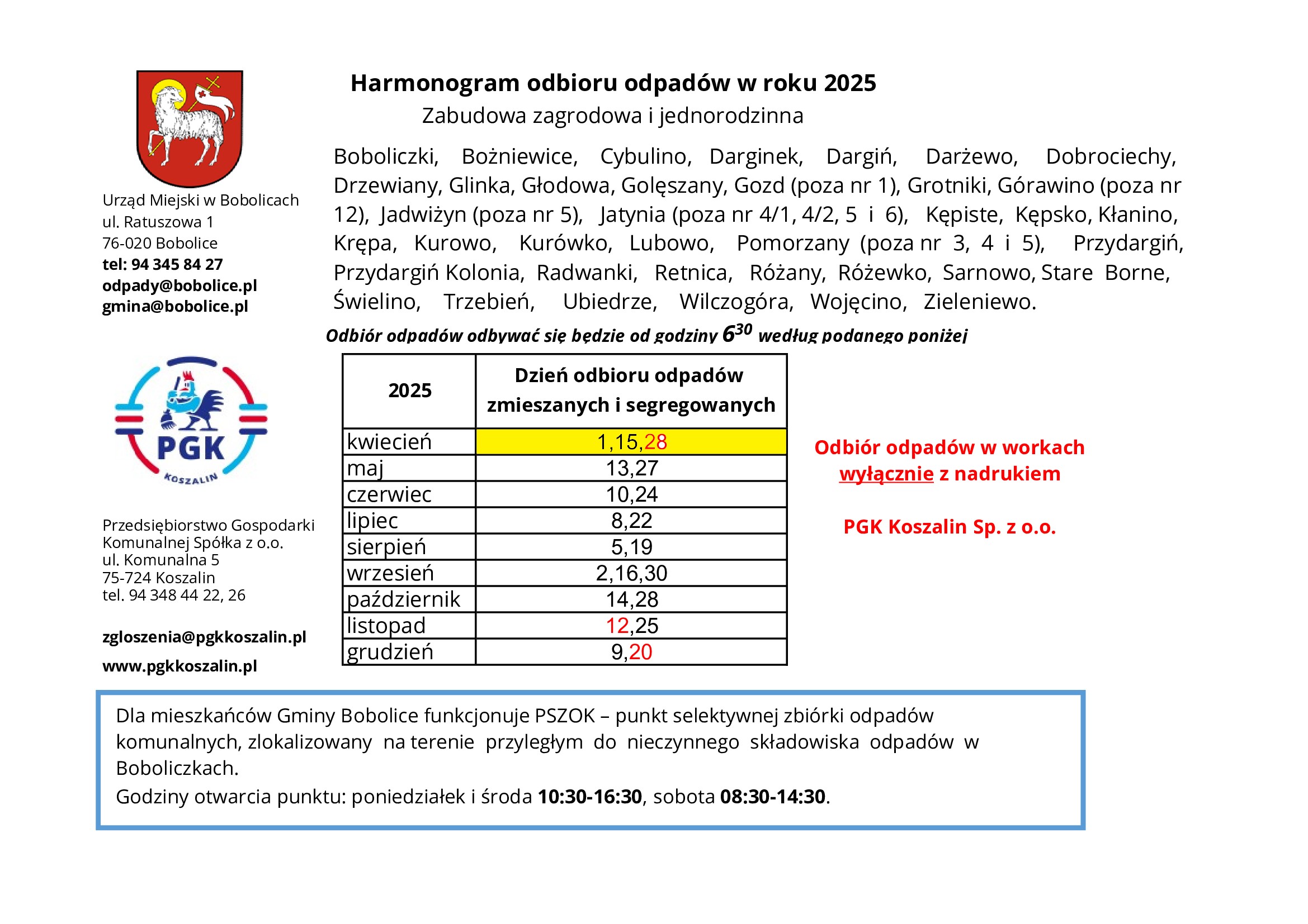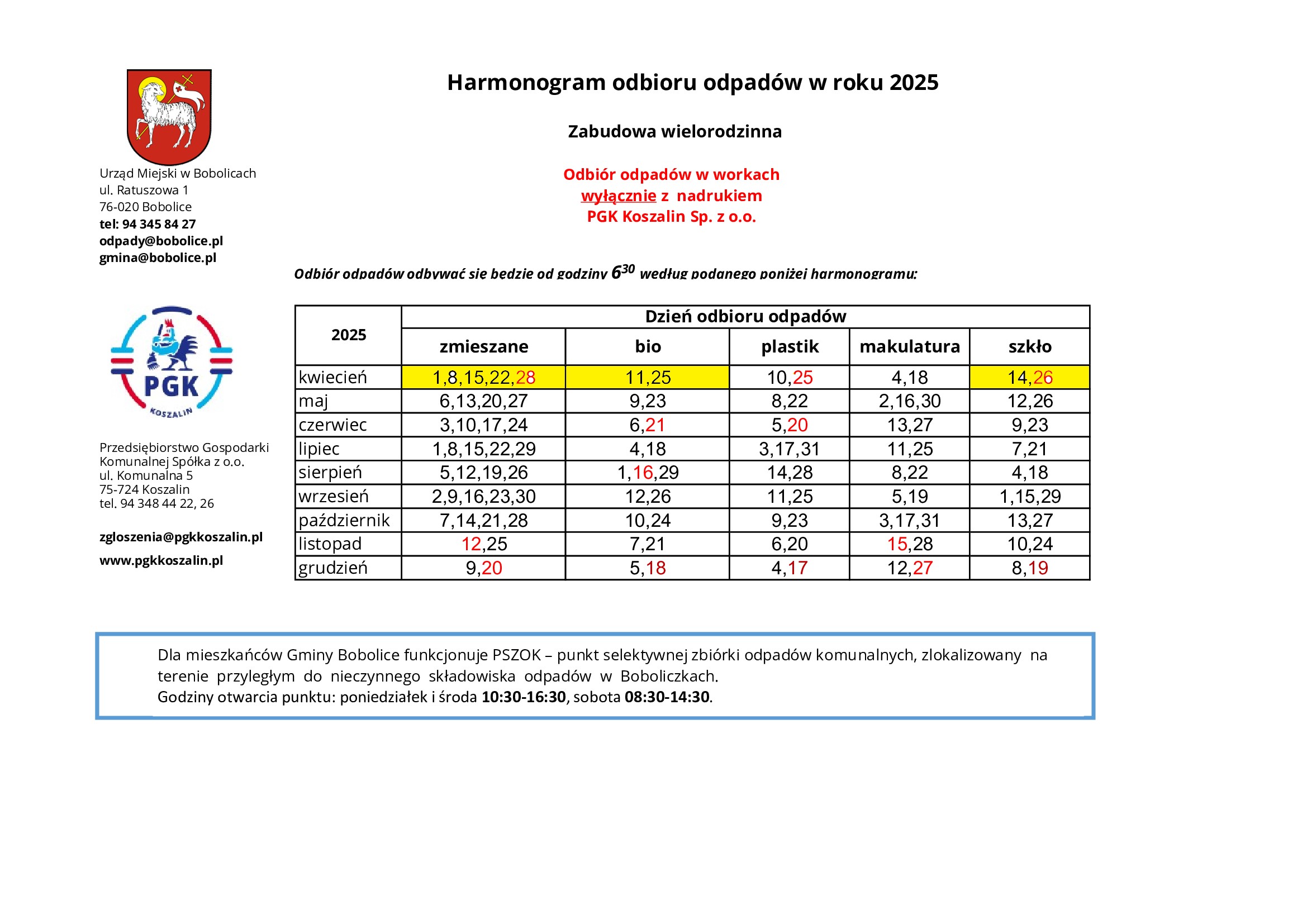 Dni oznaczone kolorem czerwonym to przesunięcia odbioru odpadów w związku z przypadającymi w tym okresie dniem świątecznym