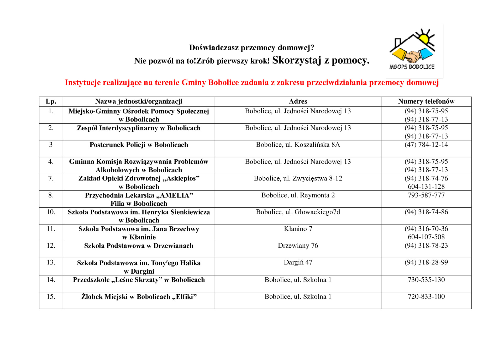 Poniżej przedstawiamy instytucje realizujące na terenie Gminy Bobolice zadania z zakresu przeciwdziałania przemocy domowej