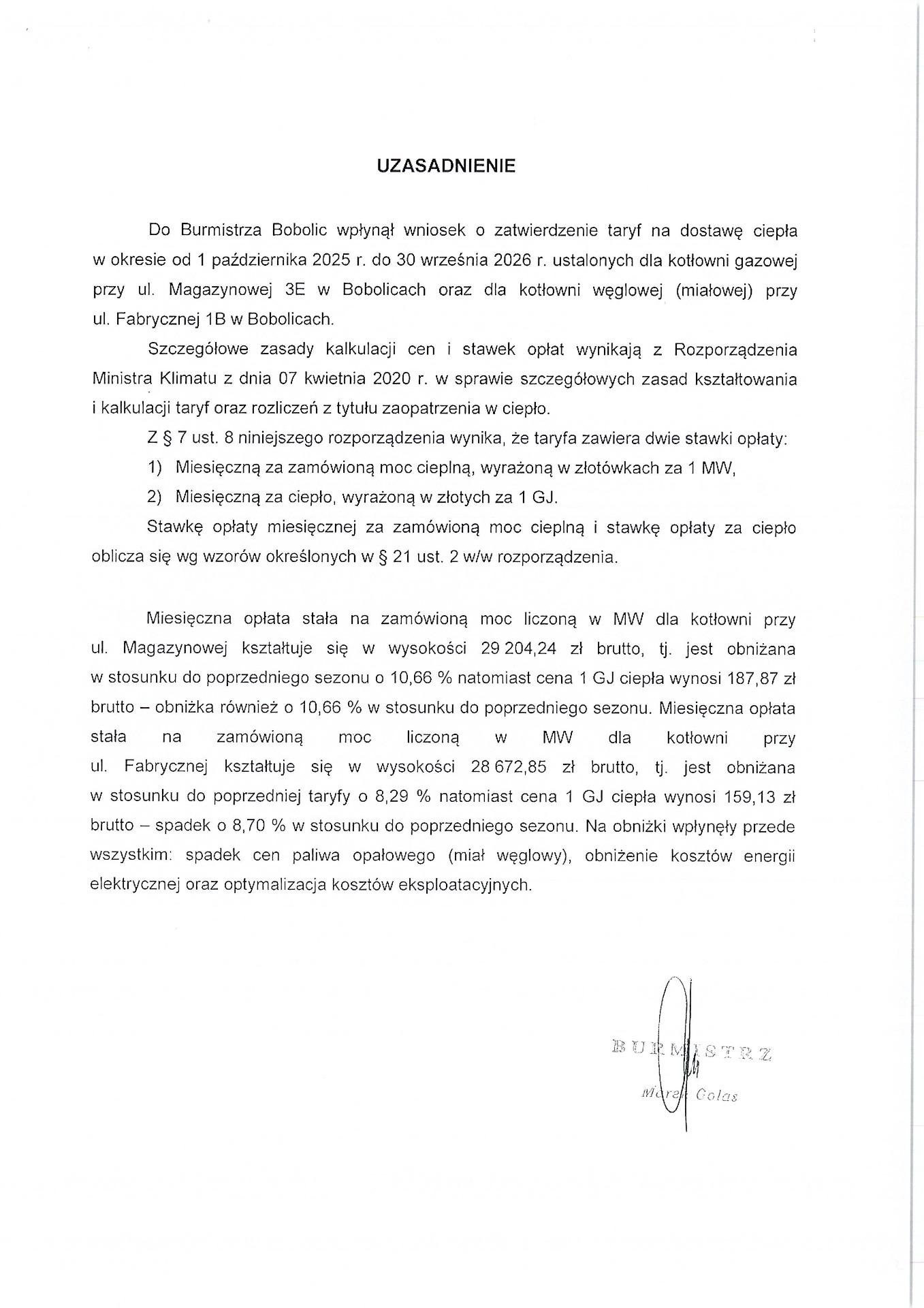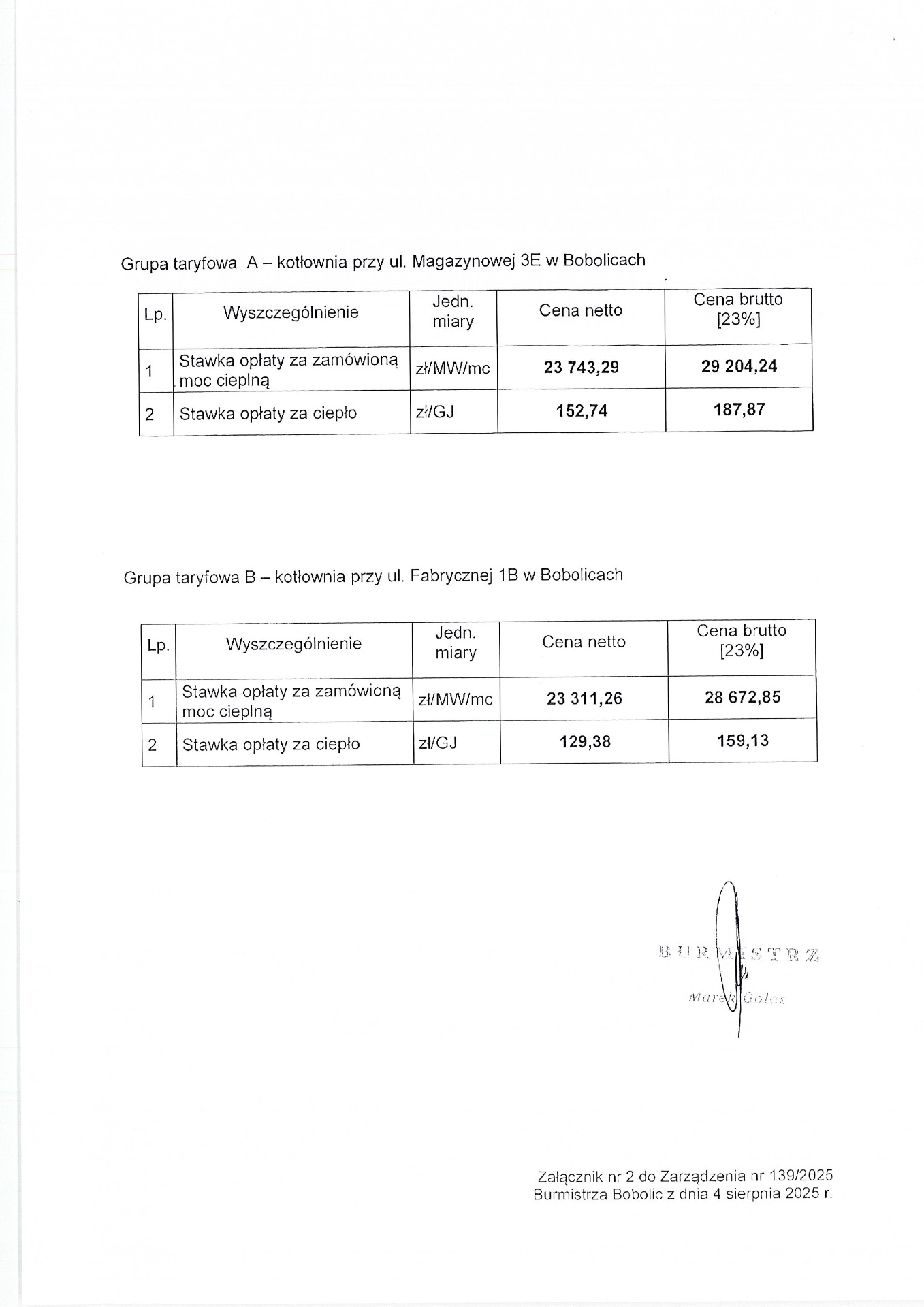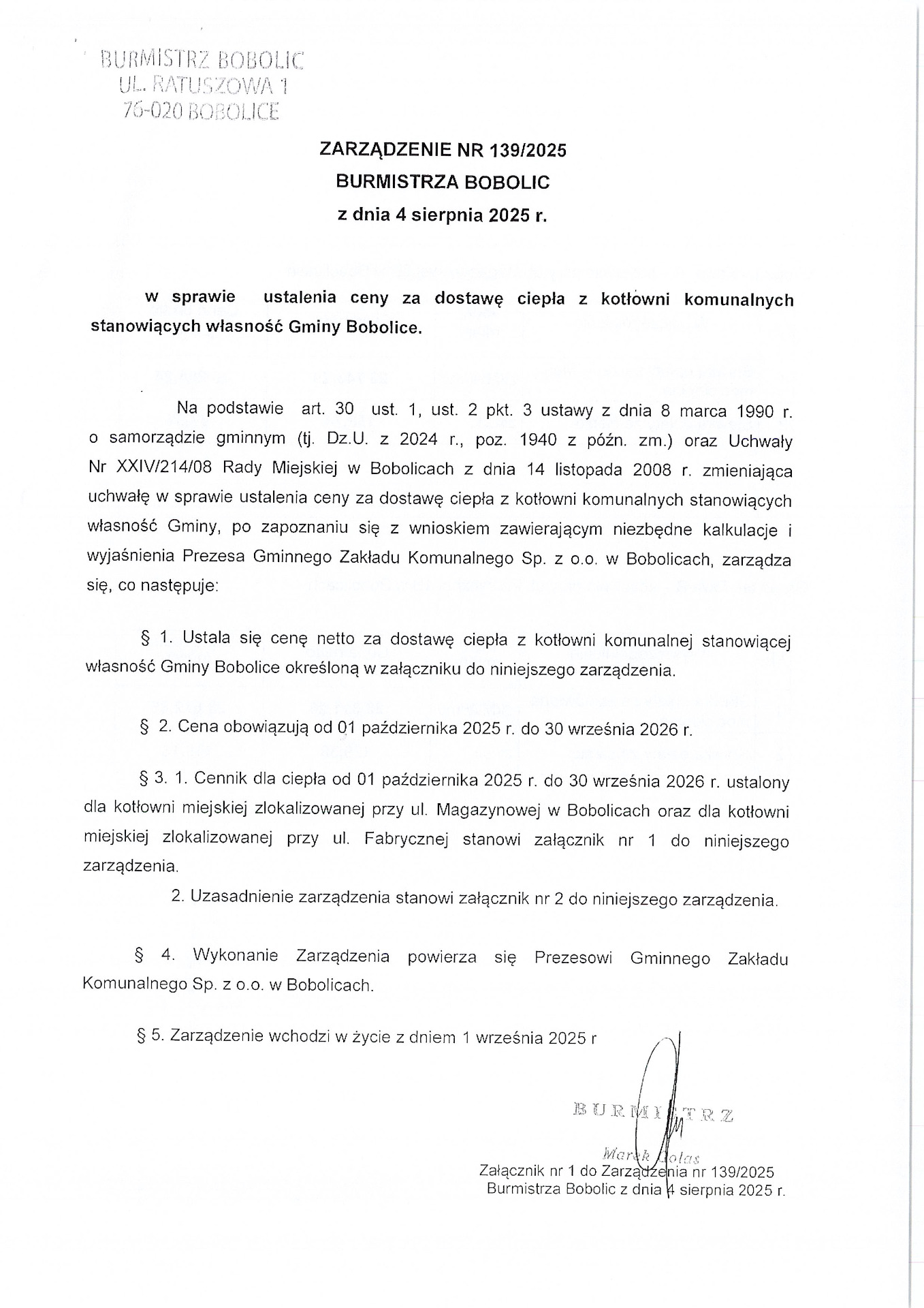 Burmistrz Bobolic Zarządzeniem 139//2025 z dnia 04.08.2025 r. ustalił ceny za dostawę ciepła z kotłowni komunalnej stanowiącej własność Gminy Bobolice.