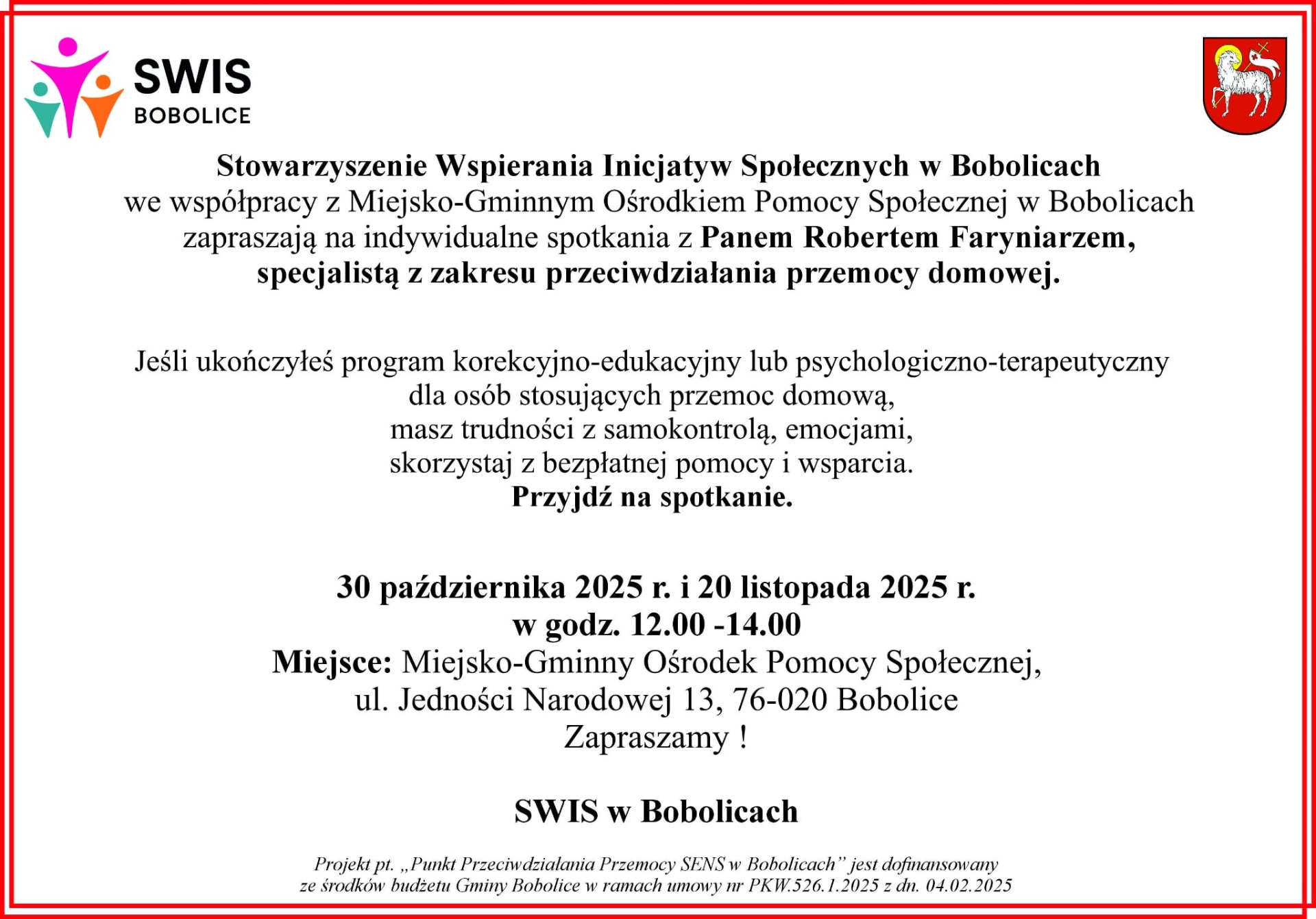 Stowarzyszenie Wspierania Inicjatyw Społecznych w Bobolicach we współpracy z Miejsko-Gminnym Ośrodkiem Pomocy Społecznej w Bobolicach zapraszają na indywidualne spotkania z Panem Robertem Faryniarzem, specjalistą z zakresu przeciwdziałania przemocy domowej.