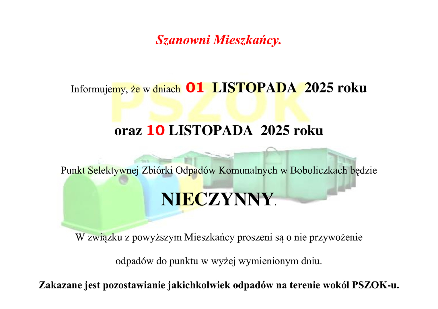 Szanowni Państwo, informujemy, że w dniu 03 LISTOPADA 2025 roku Punkt Selektywnej Zbiórki Odpadów Komunalnych w Boboliczkach będzie NIECZYNNY.