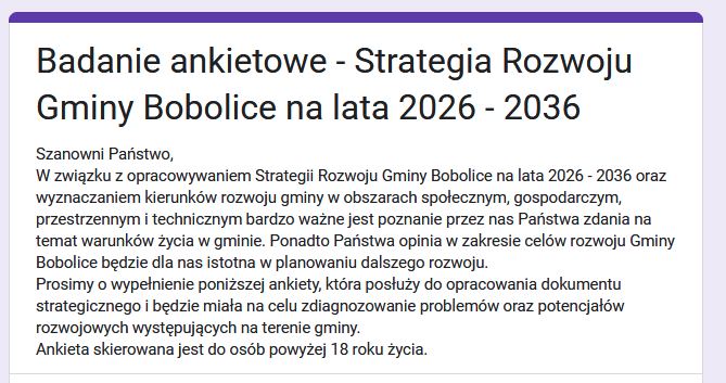 W związku z opracowywaniem Strategii Rozwoju Gminy Bobolice na lata 2026 - 2036 oraz wyznaczaniem kierunków rozwoju gminy w obszarach społecznym, gospodarczym, przestrzennym i technicznym bardzo ważne jest poznanie przez nas Państwa zdania na temat warunków życia w gminie. Ponadto Państwa opinia w zakresie celów rozwoju Gminy Bobolice będzie dla nas istotna w planowaniu dalszego rozwoju.