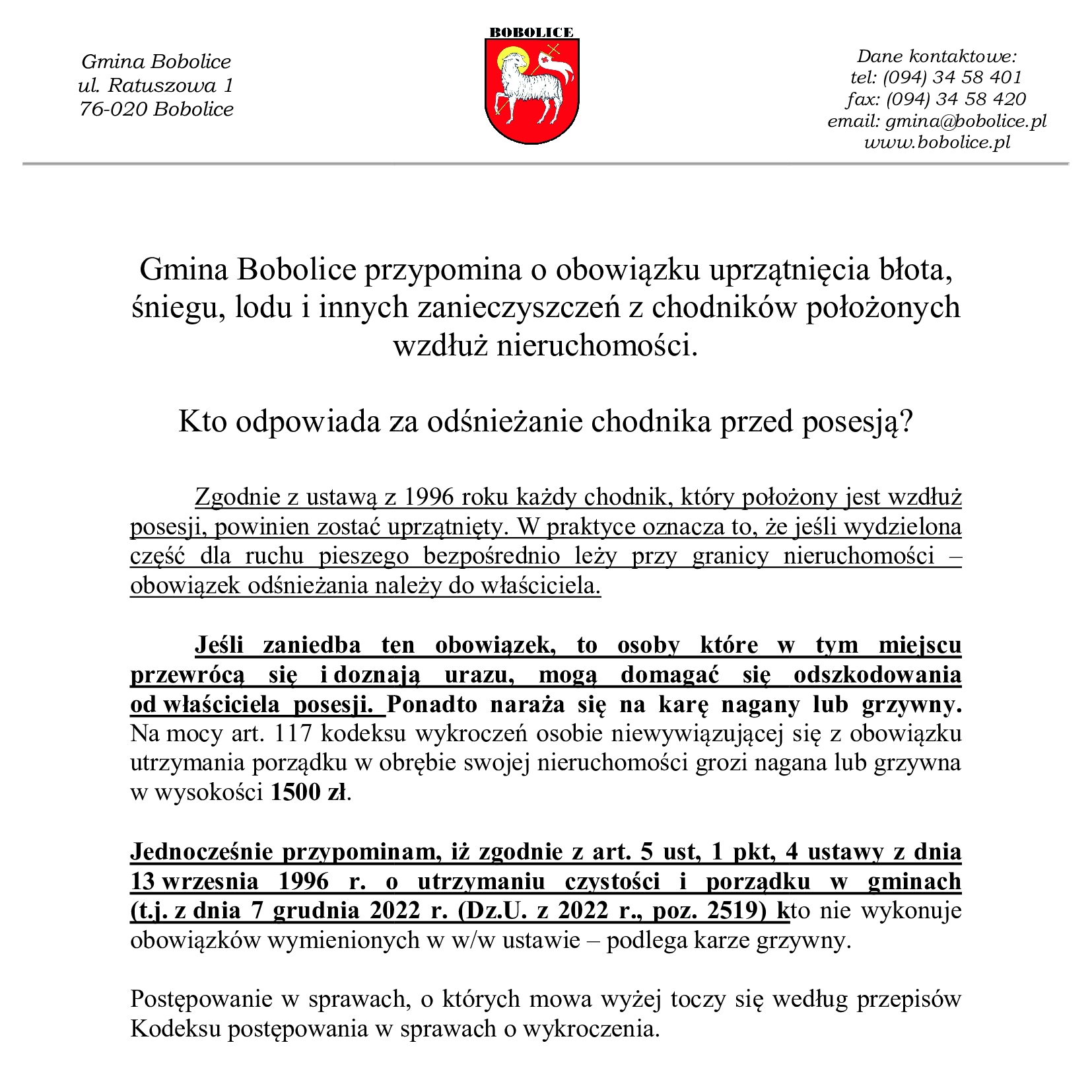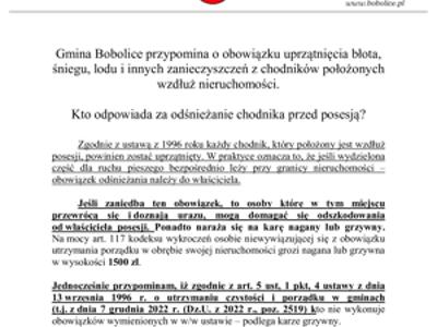 Przypominamy, że za odśnieżanie i usuwanie śliskości z chodnika przylegającego bezpośrednio do posesji odpowiada właściciel lub zarządca nieruchomości. Obowiązek ten wynika z art. 5 ust. 1 pkt 4 ustawy o utrzymaniu czystości i porządku w gminach.