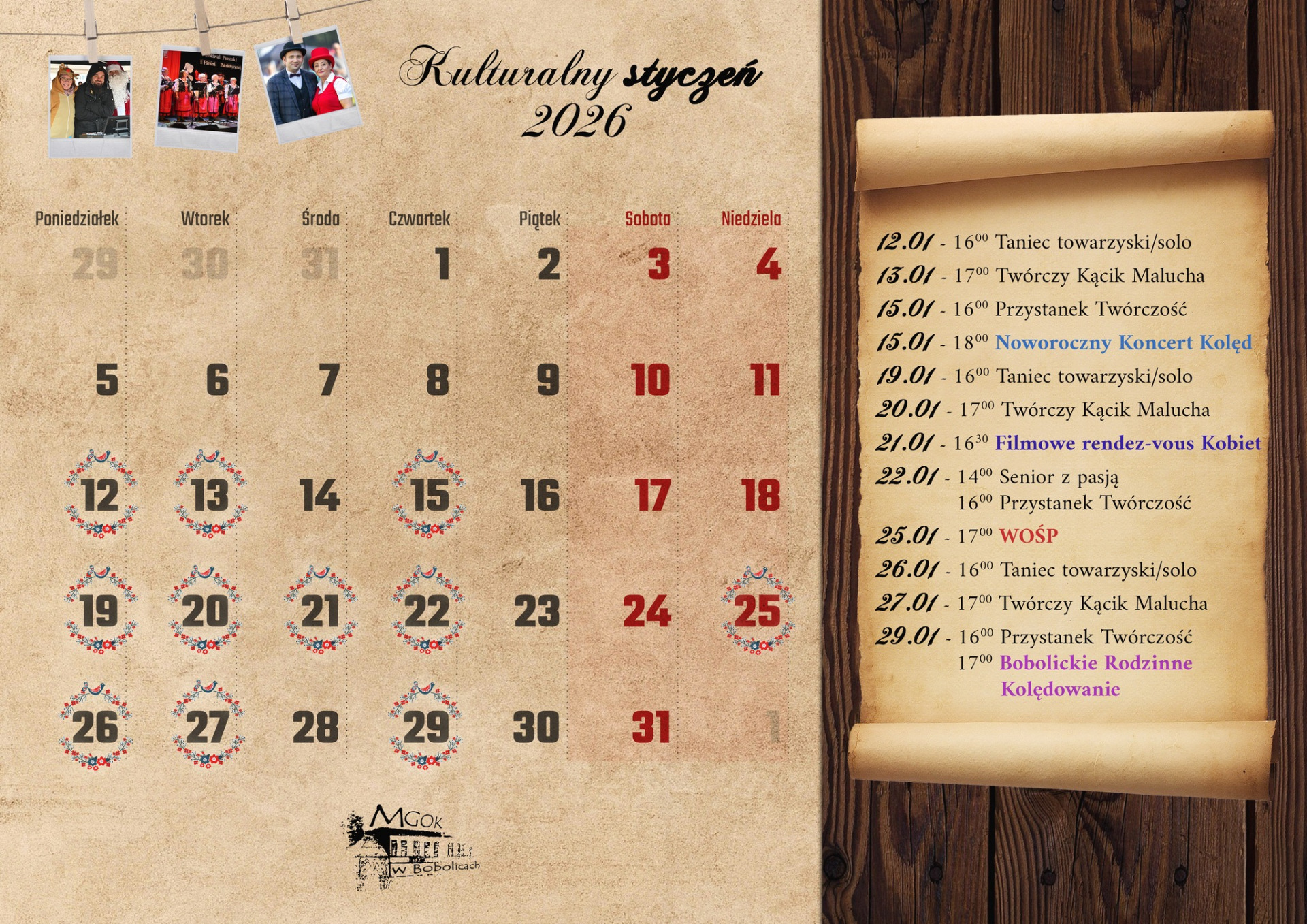 Serdecznie zapraszamy do korzystania z szerokiej oferty kulturalnej przygotowanej przez Miejsko - Gminny Ośrodek Kultury w Bobolicach w miesiącu styczniu 2026 r.![]()