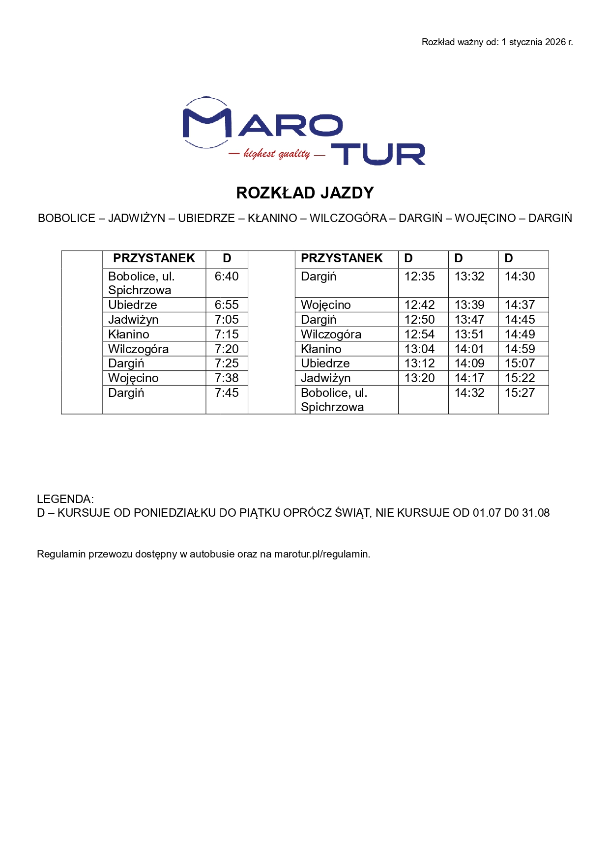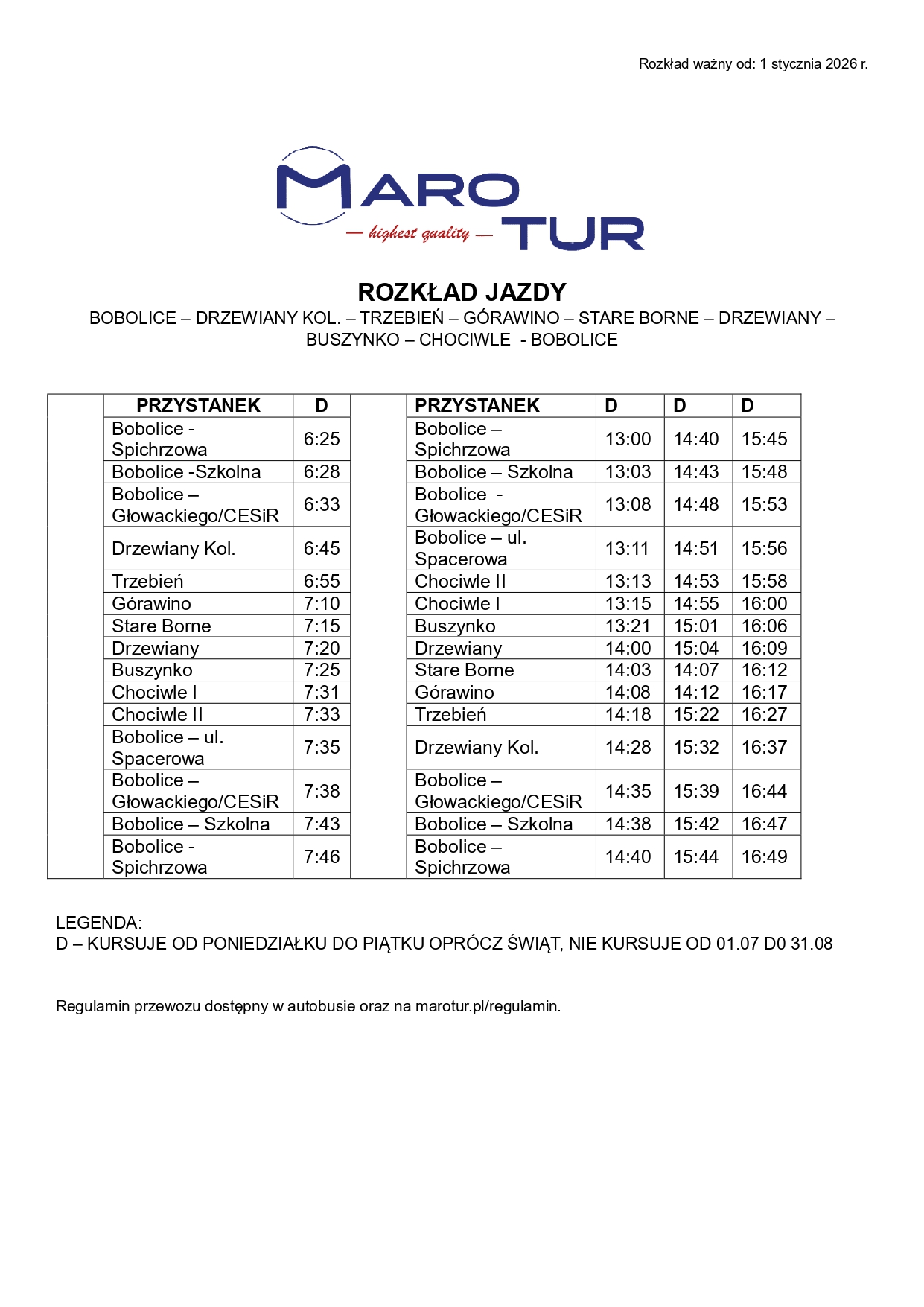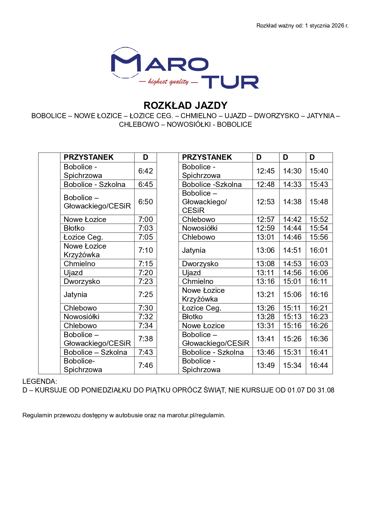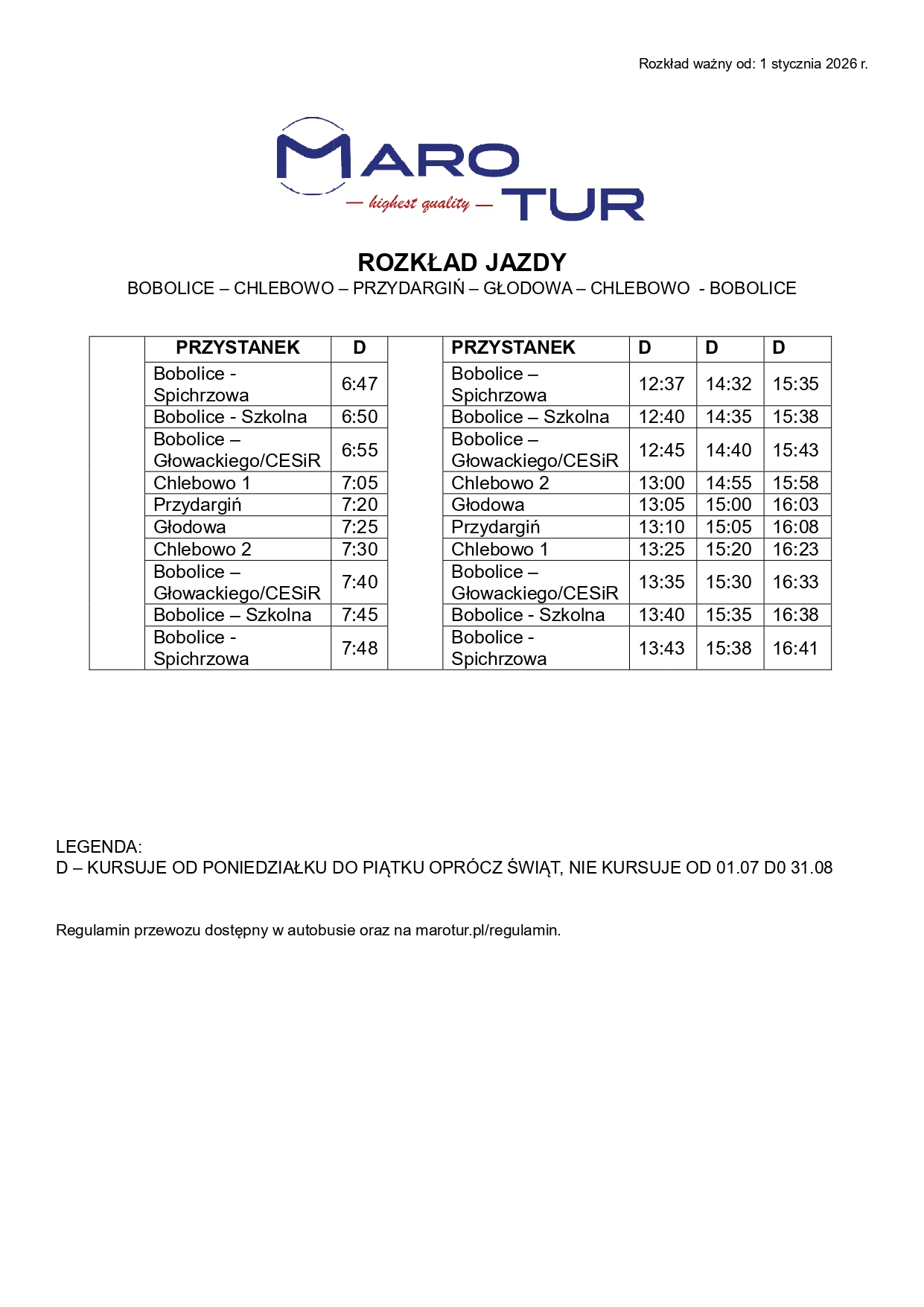 Uprzejmie informujemy, że Gmina Bobolice uzyskała dofinansowanie na 2026 rok z Funduszu Rozwoju Przewozów Autobusowych. Dzięki przyznanym środkom od 1 stycznia 2026 r. uruchomionych zostało 8 linii na terenie naszej gminy, z czego 5 linii rozpoczyna i kończy kurs na przystanku przy ul. Spichrzowej w Bobolicach. Nowe połączenia ułatwią codzienne dojazdy do pracy, szkół, placówek zdrowia oraz instytucji publicznych. Szczegółowe informacje dotyczące tras i rozkładów jazdy dostępne są w załącznikach poniżej.