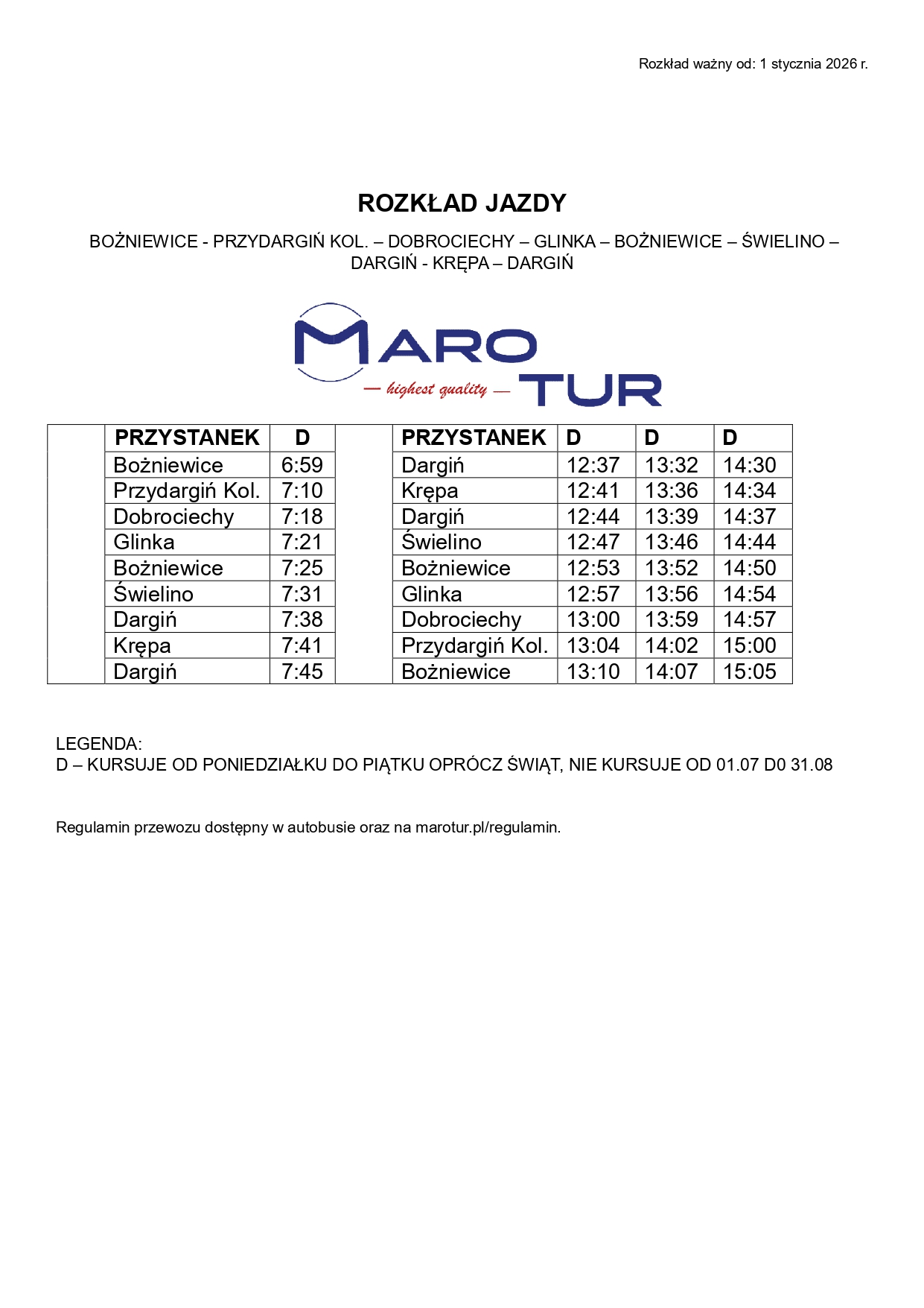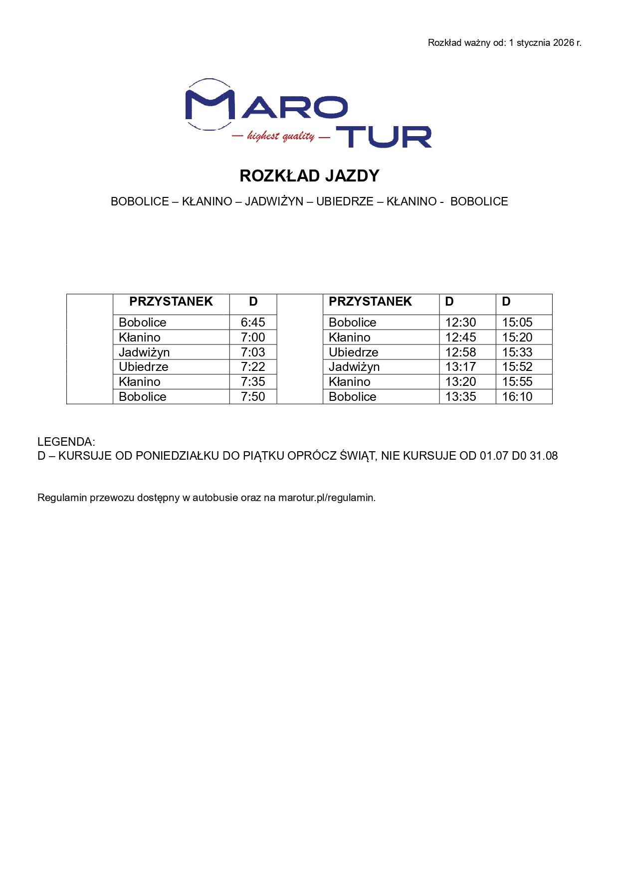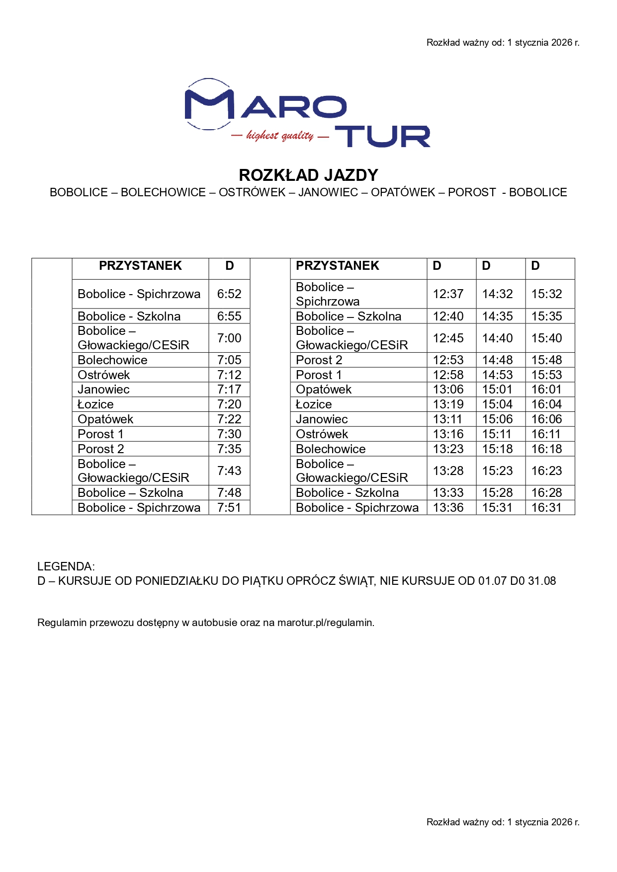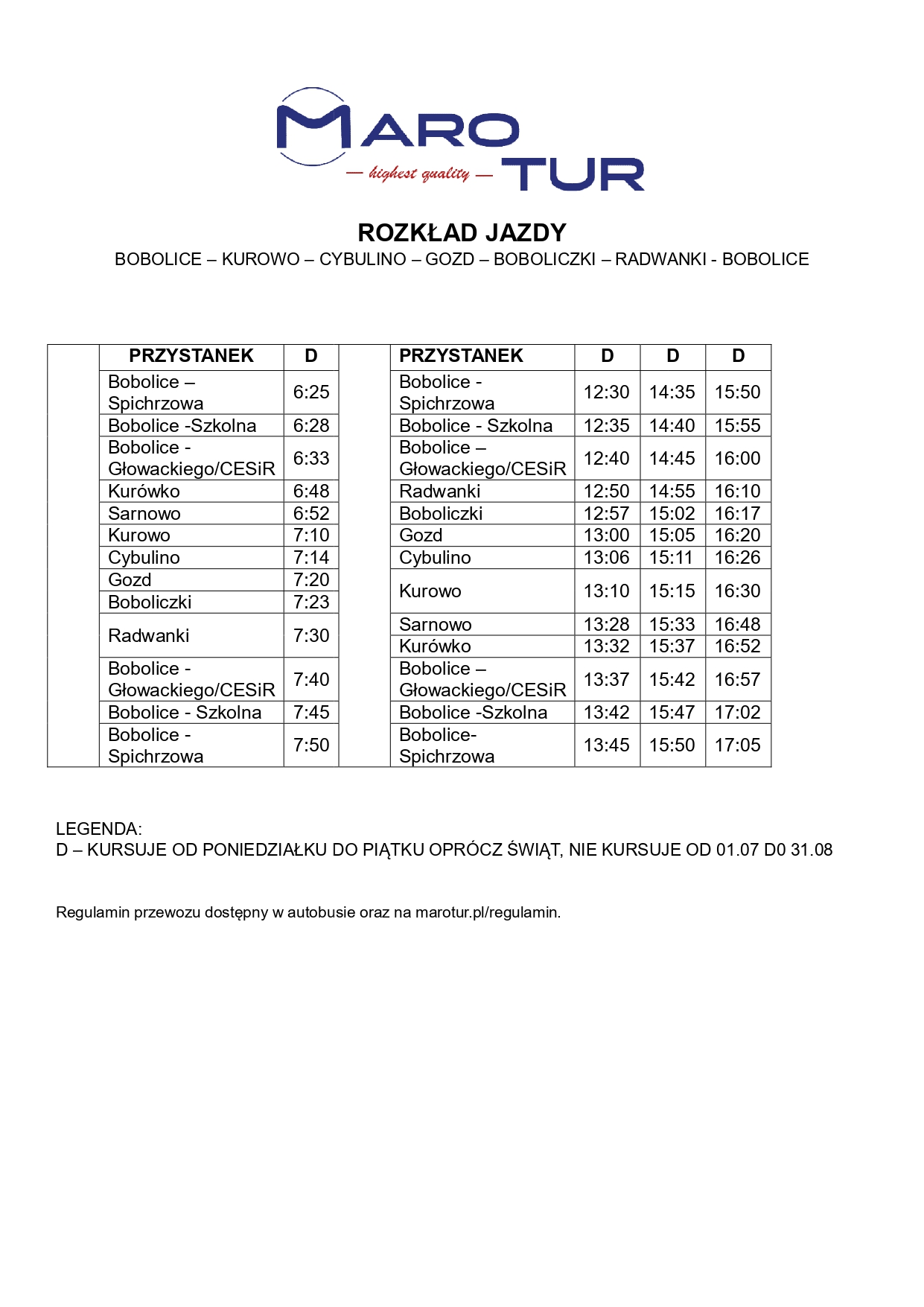 Uprzejmie informujemy, że Gmina Bobolice uzyskała dofinansowanie na 2026 rok z Funduszu Rozwoju Przewozów Autobusowych. Dzięki przyznanym środkom od 1 stycznia 2026 r. uruchomionych zostało 8 linii na terenie naszej gminy, z czego 5 linii rozpoczyna i kończy kurs na przystanku przy ul. Spichrzowej w Bobolicach. Nowe połączenia ułatwią codzienne dojazdy do pracy, szkół, placówek zdrowia oraz instytucji publicznych. Szczegółowe informacje dotyczące tras i rozkładów jazdy dostępne są w załącznikach poniżej.