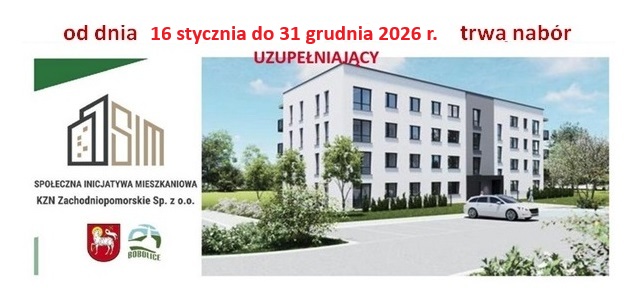 Burmistrz Bobolic uprzejmie informuje, że od dnia 16 stycznia 2026 r. do 31 grudnia 2026 r. trwa kolejny nabór uzupełniający wniosków o zawarcie umowy najmu lokali mieszkalnych, położonych w gminie Bobolice, tworzonych z udziałem Gminy Bobolice, zaplanowanych do realizacji w ramach inwestycji spółki Społecznej Inicjatywy Mieszkaniowej „KZN - Zachodniopomorskie” Sp. z o.o. z siedzibą w Koszalinie, tj. budowy budynku mieszkalnego wielorodzinnego przy ul. Polnej w Bobolicach.