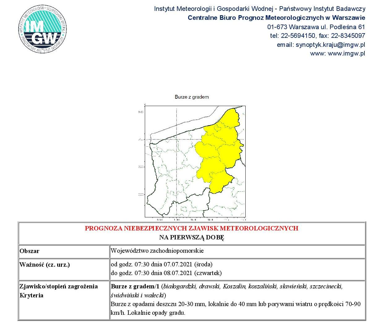powyżej ostrzeżenie o możliwych burzach z gradem w dniach 7 lipca (środa) oraz 8 lipca (czwartek) 2021 r. od godz. 7.30.