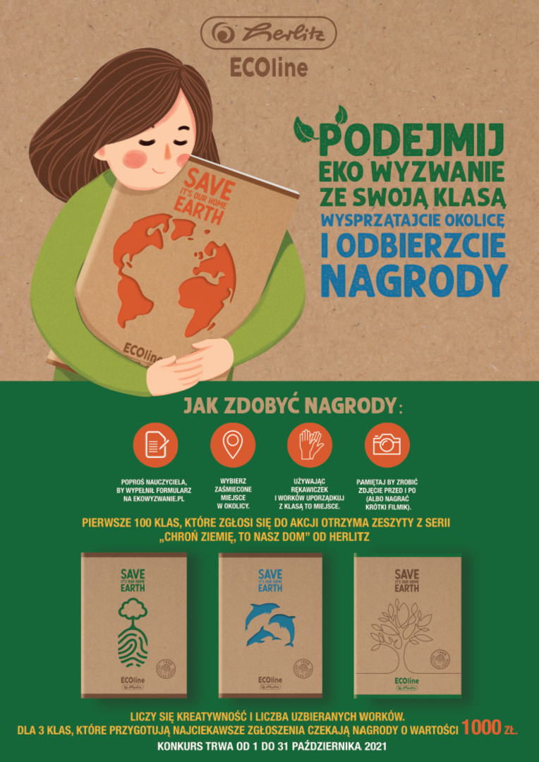 Przez cały październik pod adresem http://ekowyzwanie.pl/ nauczyciele mogą zgłaszać klasy do drugiej edycji konkursu. Głównym zadaniem jest posprzątanie wspólnie z klasą wybranego przez siebie miejsca i wykonanie zdjęć tej metamorfozy. Wyzwanie można rzucić kolejnym szkołom poprzez nominację. Wystarczy wpisać jej dane w formularzu zgłoszeniowym i poinformować ją o #ekowywzwaniu.Pierwsze 100 szkół, które prześlą zgłoszenie, otrzyma od Herlitz zestawy zeszytów z serii EcoLine. Na zdobywców 3 pierwszych miejsc czekają artykuły papiernicze o wartości 1000 zł.
