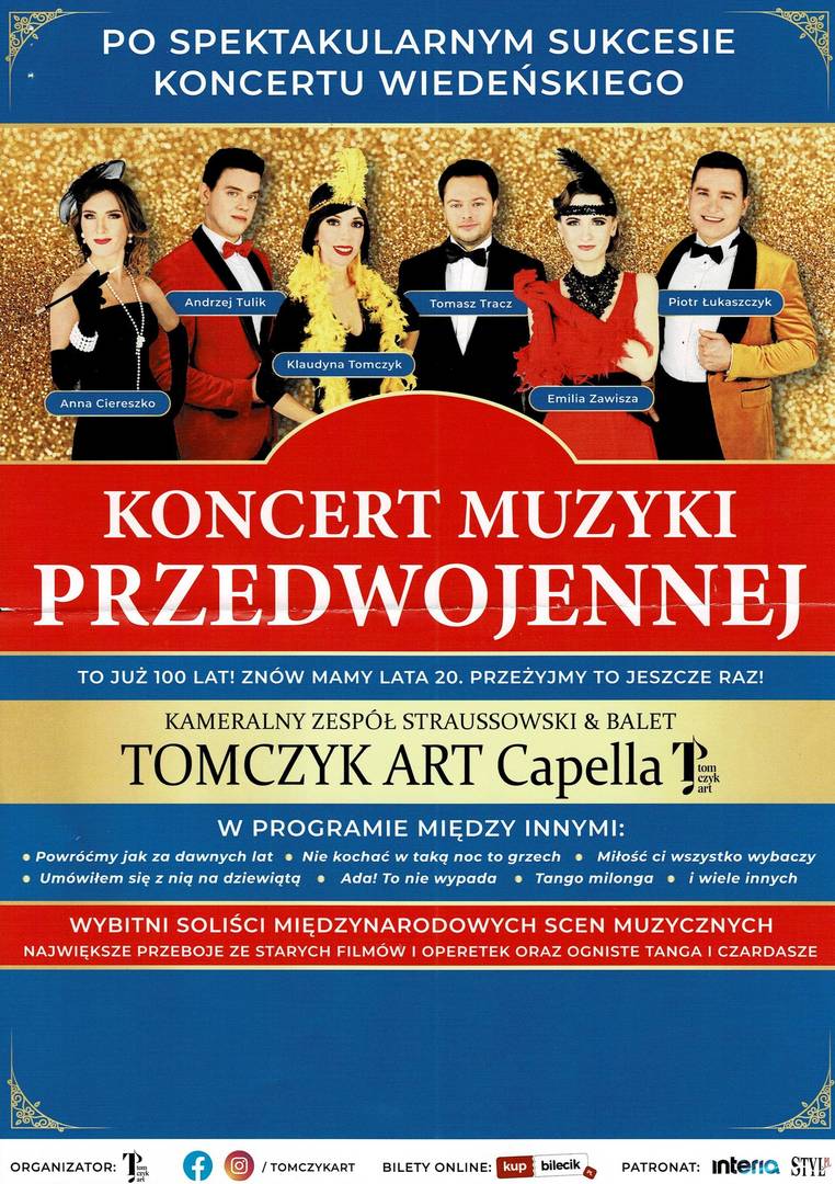 Podczas koncertu usłyszą Państwo obdarzonych wspaniałymi głosami, fantastycznych solistów operowych. Towarzyszyć im będzie Straussowski Zespół Kameralny, składający się z wybitnych muzyków młodego pokolenia, występujących na co dzień z najlepszymi orkiestrami i dyrygentami w Polsce i Europie. Na scenie wystąpią także wielokrotnie nagradzane gwiazdy polskiego i międzynarodowego baletu oraz laureaci międzynarodowych konkursów muzycznych, wirtuozi skrzypiec, fortepianu, wspaniali soliści polskiej estrady, artyści występujący w największych polskich i światowych salach koncertowych, filharmonicznych oraz operowych. Wzruszają i bawią publikę od wielu lat, za każdym razem przyjmowani owacjami na stojąco! To połączenie klasycznej formy i kunsztu z młodością, wdziękiem, werwą i niespotykaną muzykalnością artystów wykonujących to muzyczne widowisko! Niekwestionowany, najbardziej rozpoznawalny polski zespół wykonujący muzykę Króla Walca - Johanna Straussa tym razem zaprezentuje się Państwu w repertuarze muzyki przedwojennej.