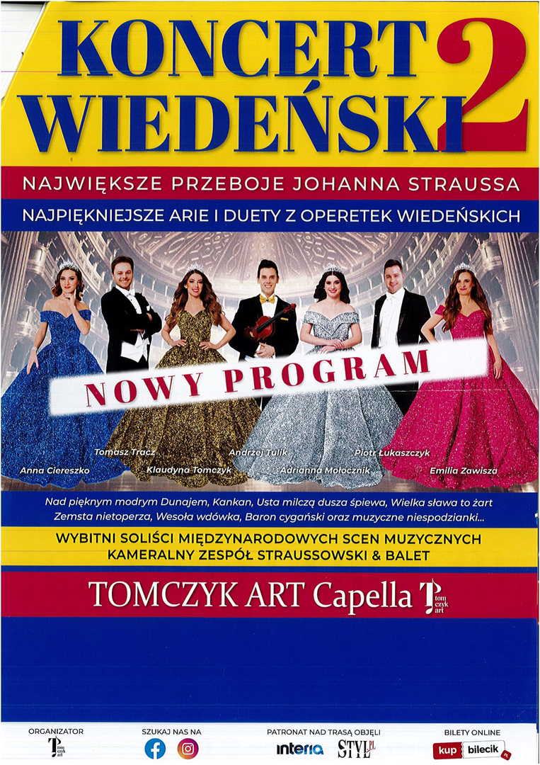 Gwiazdorska obsada, balet, orkiestra kameralna, przepiękne głosy które zachwycają publiczność w każdym wieku! Znakomite widowisko dla całej rodziny. Noworoczny Koncert Wiedeński to także zapierające dech w piersiach, bajkowe kostiumy, które przeniosą również najmłodszych widzów do magicznego, wiedeńskiego świata Króla Walca - Johanna Straussa. U nas nie zabraknie muzycznych żartów, niespodzianek i skeczów. Udowodnimy tym samym, że muzyka łączy pokolenia i nie zna granic!