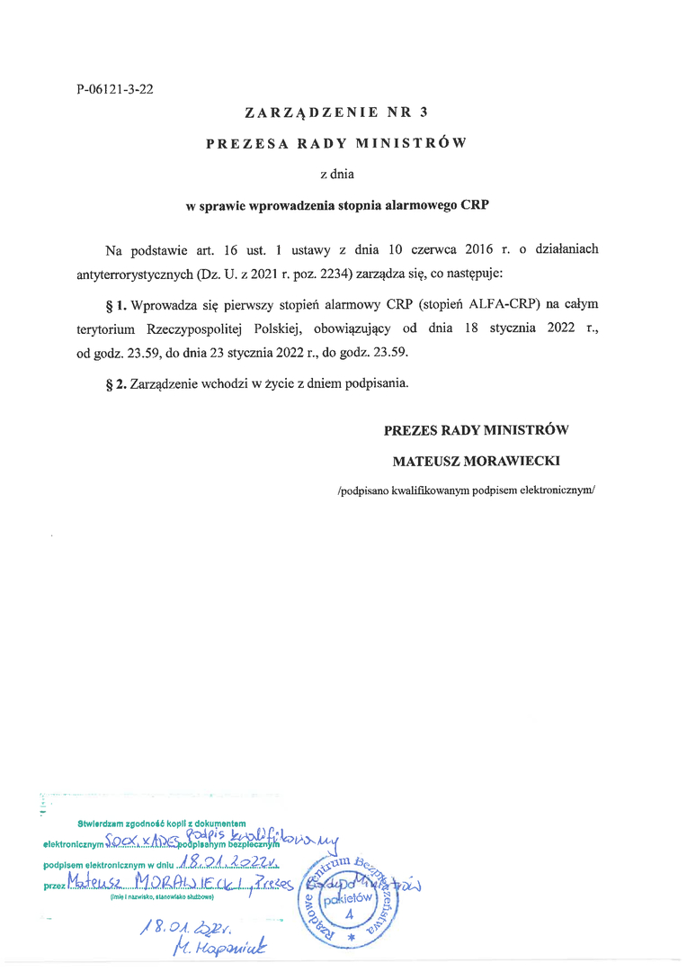 Zarządzenie Prezesa Rady Ministrów w prawie wprowadzenia stopnia alarmowego CRP