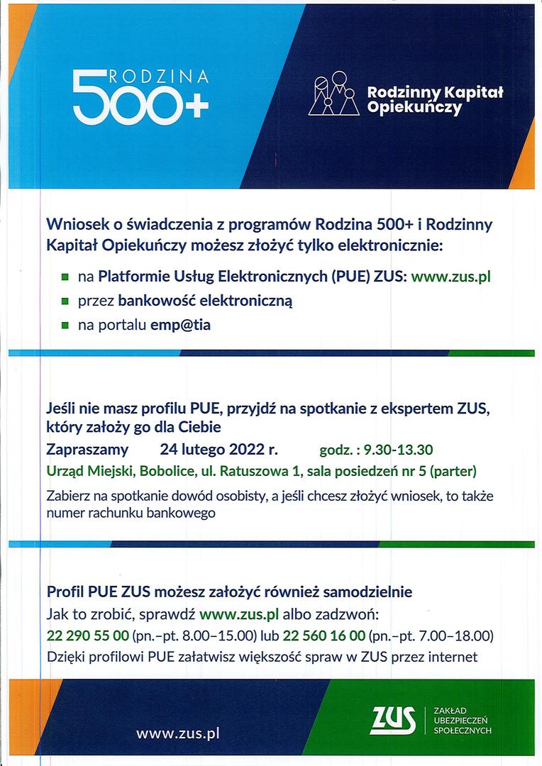 W ramach współpracy Zakładu Ubezpieczeń Społecznych z Gminą Bobolice zapraszamy Mieszkańców Gminy Bobolice w dniu 24.02.2022 r w godz. od 09.30 do 13.30 do sali Nr 5 w Urzędzie Miejskim w Bobolicach. Eksperci ZUS pomogą założyć profil PUE niezbędny do złożenia wniosku. Szczegóły na plakacie.