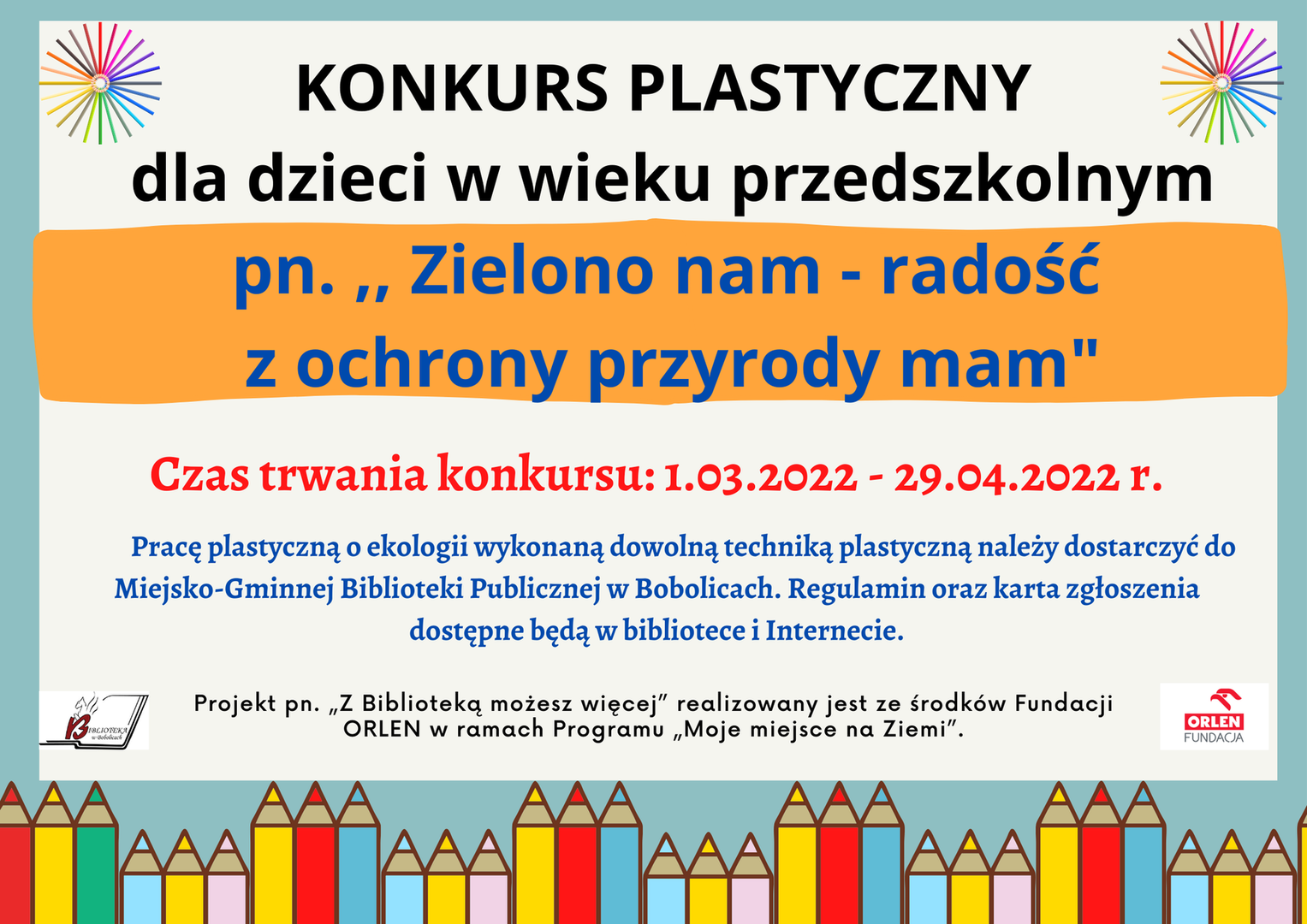 realizowanych zgodnie z projektem pn. "Z Biblioteką możesz więcej" ze środków Fundacji ORLEN w ramach Programu „Moje miejsce na Ziemi”. Czekamy na wasze prace do 29.04.2022!