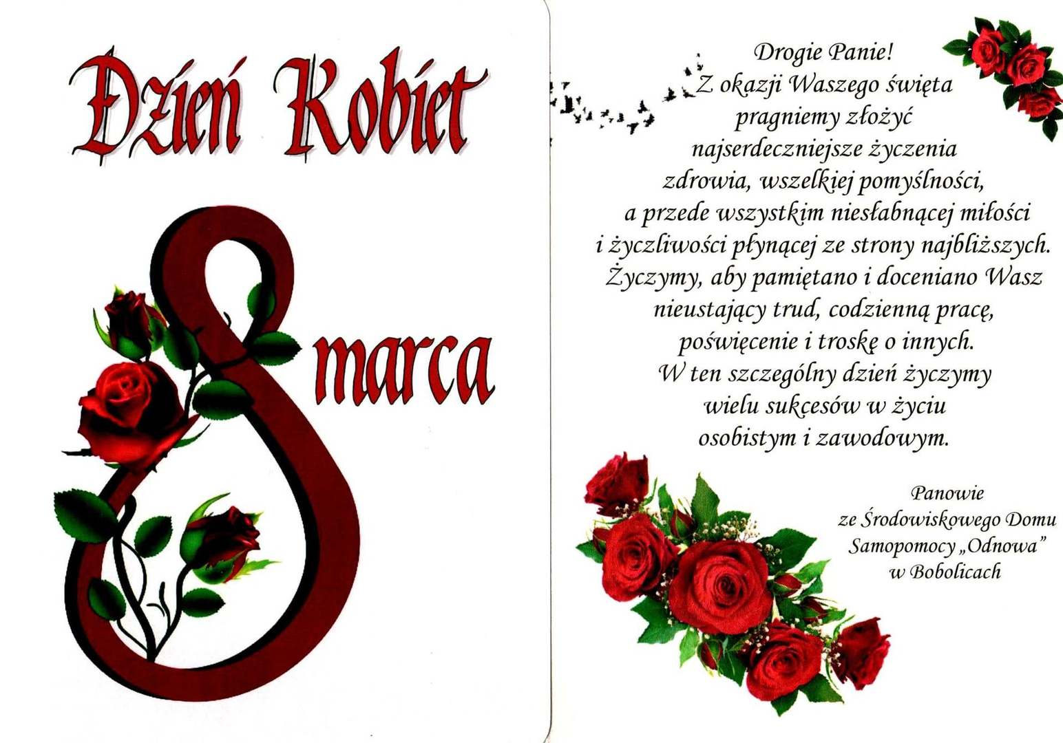 marcowy dzień Panowie z „Odnowy” z radosnymi życzeniami odwiedzili Panią Burmistrz. Laurka z życzeniami i serduszko wykonane w ramach zajęć sprawiło dużo radości u Kobiety reprezentującej Płeć Piękną w naszej gminie. Po wizycie u Pani Burmistrz mężczyźni z „Odnowy sprawili niespodziankę wszystkim Paniom w ŚDS, wręczając symboliczną różyczkę i laurkę. ![]()