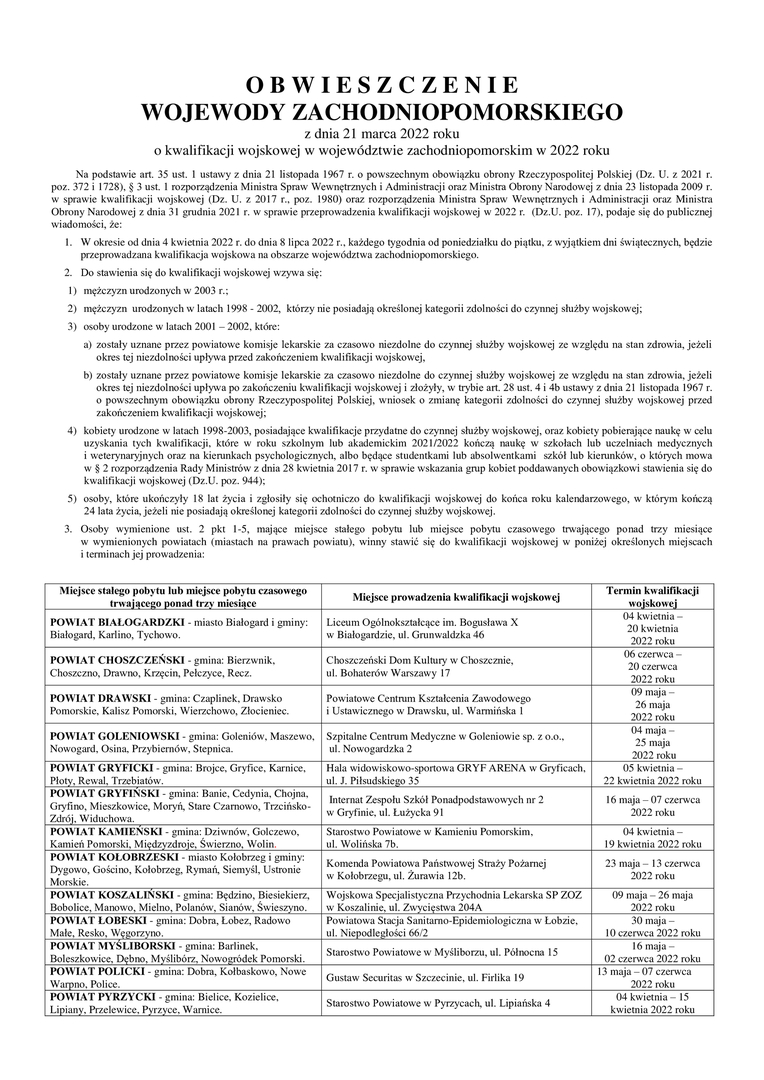 O B W I E S Z C Z E N I E WOJEWODY ZACHODNIOPOMORSKIEGO z dnia 21 marca 2022 roku o kwalifikacji wojskowej w województwie zachodniopomorskim w 2022 roku