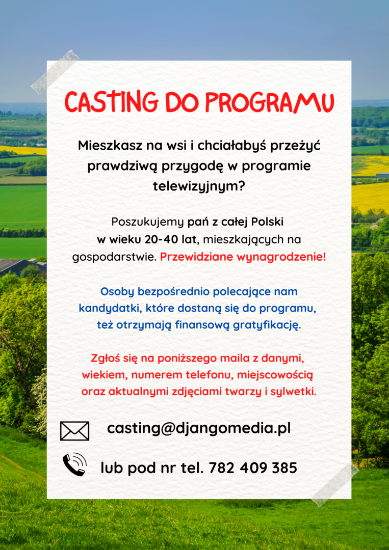 Zainteresowanych prosimy o wysłanie maila pod casting@djangomedia.pl wraz z imieniem i nazwiskiem, numerem telefonu i miejscem zamieszkania lub o zgłoszenie pod numer 782 409 385.