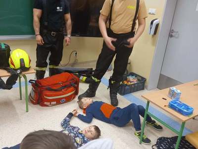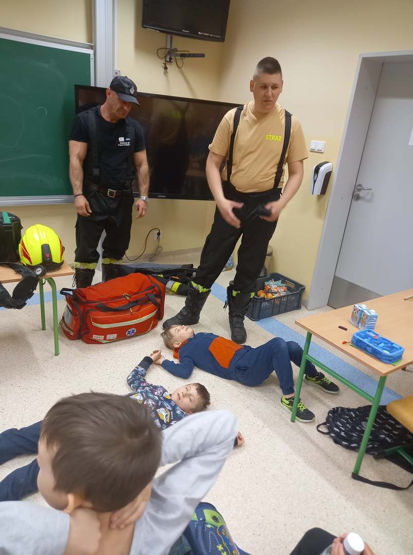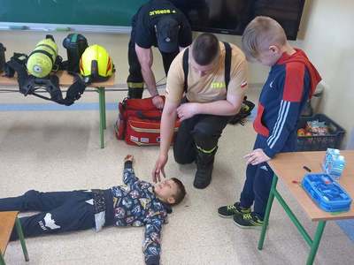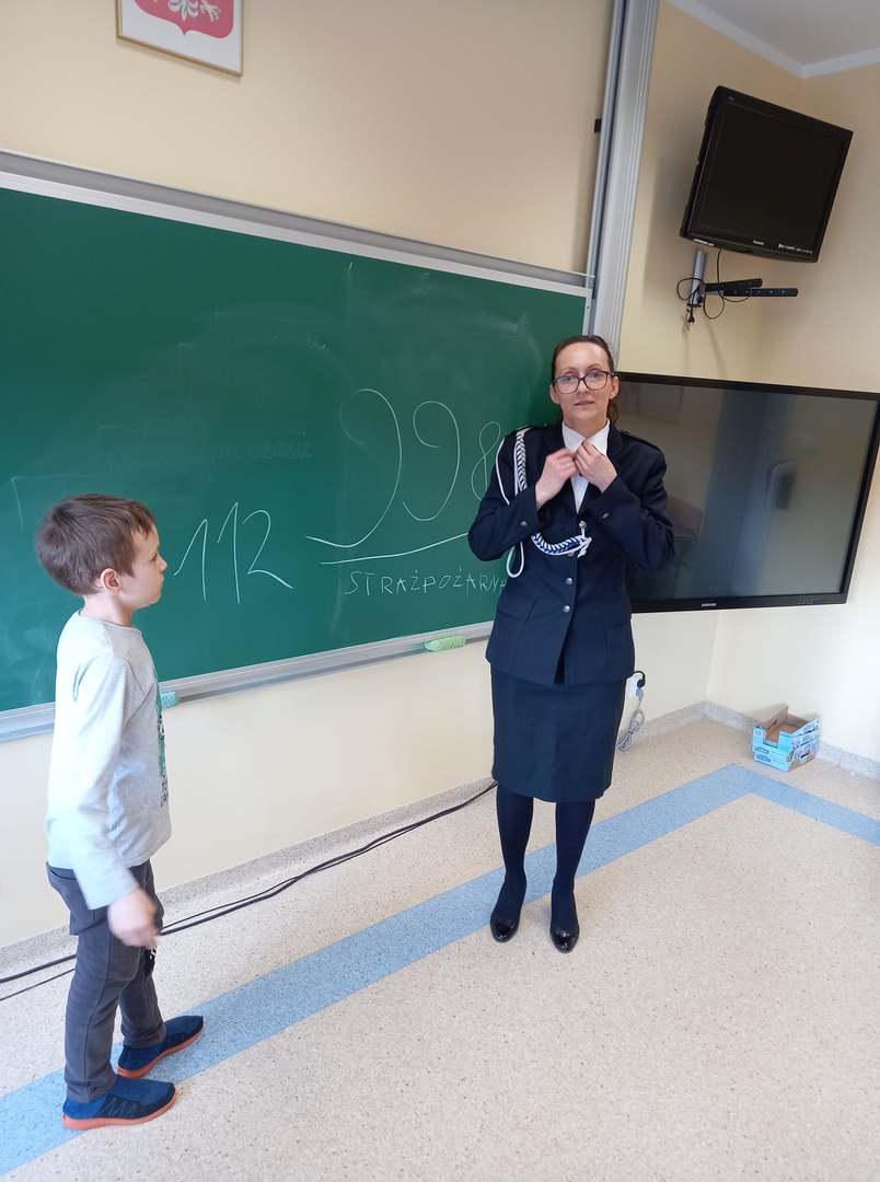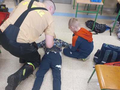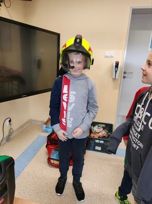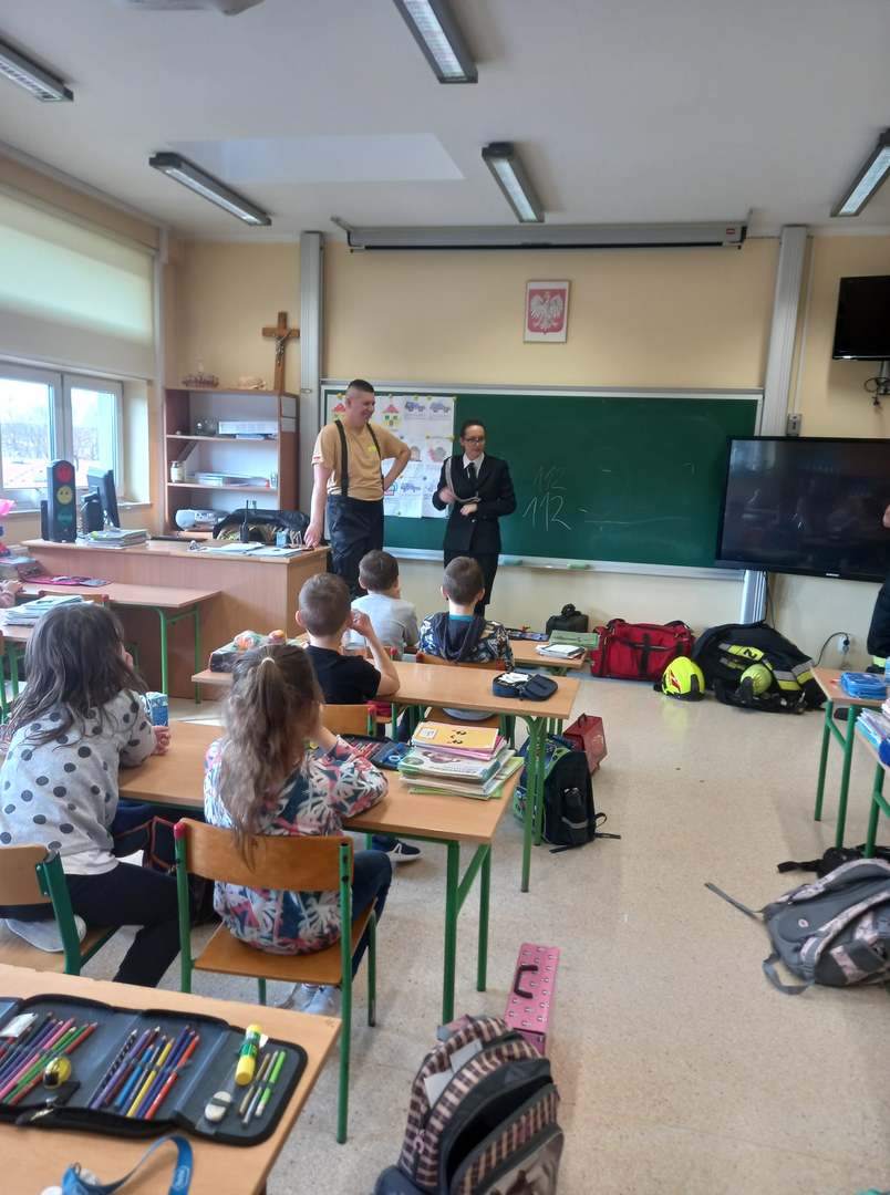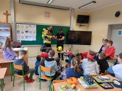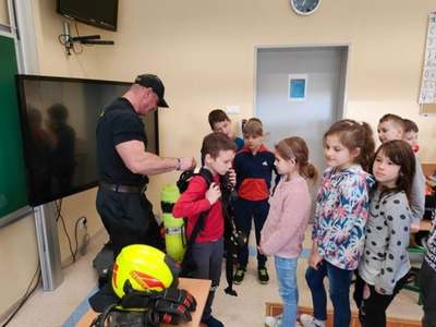Panowie strażacy zademonstrowali osobisty sprzęt strażaka biorącego udział w akcji ratowniczej. Dzieci dowiedziały się jak można zapobiegać niektórym wypadkom i niebezpiecznym szczególnie dla dzieci sytuacjom. Przedstawiciel straży zapoznał dzieci z najważniejszymi zasadami postępowania na wypadek pożaru. Uczniowie dowiedzieli się, w jakich okolicznościach należy wzywać straż pożarną, utrwaliły numer alarmowy 112. Zafascynowane i zaciekawione dzieci wykazały ogromne zainteresowanie spotkaniem, podczas którego nabyły wiedzę dotyczącą zasad zachowania bezpieczeństwa oraz odpowiedzialnej i pożytecznej pracy strażaka. Takie spotkanie jest świetną okazją do bliższego poznania zawodu strażaka i niebezpieczeństw z nim związanych. Spotkanie przebiegało w miłej i serdecznej atmosferze, za co bardzo dziękujemy.