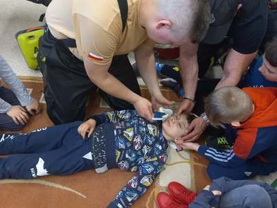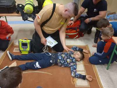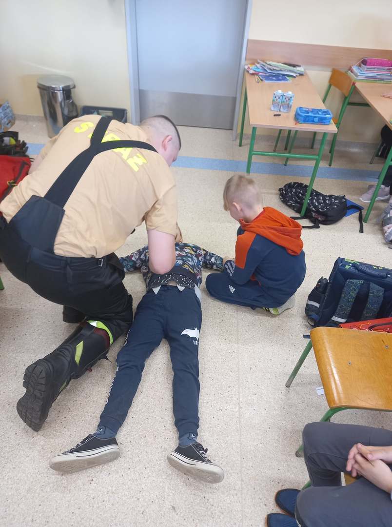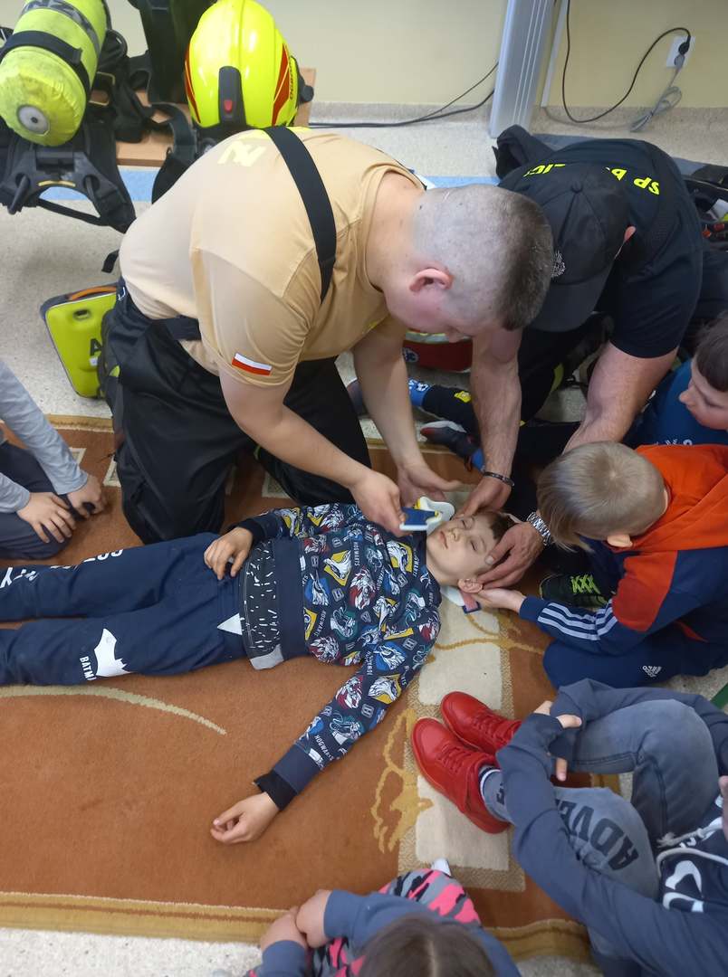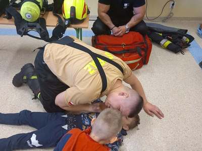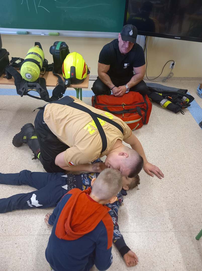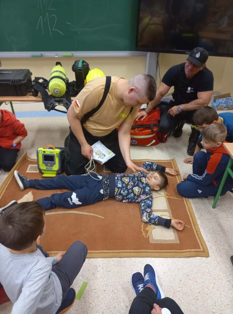 Panowie strażacy zademonstrowali osobisty sprzęt strażaka biorącego udział w akcji ratowniczej. Dzieci dowiedziały się jak można zapobiegać niektórym wypadkom i niebezpiecznym szczególnie dla dzieci sytuacjom. Przedstawiciel straży zapoznał dzieci z najważniejszymi zasadami postępowania na wypadek pożaru. Uczniowie dowiedzieli się, w jakich okolicznościach należy wzywać straż pożarną, utrwaliły numer alarmowy 112. Zafascynowane i zaciekawione dzieci wykazały ogromne zainteresowanie spotkaniem, podczas którego nabyły wiedzę dotyczącą zasad zachowania bezpieczeństwa oraz odpowiedzialnej i pożytecznej pracy strażaka. Takie spotkanie jest świetną okazją do bliższego poznania zawodu strażaka i niebezpieczeństw z nim związanych. Spotkanie przebiegało w miłej i serdecznej atmosferze, za co bardzo dziękujemy.