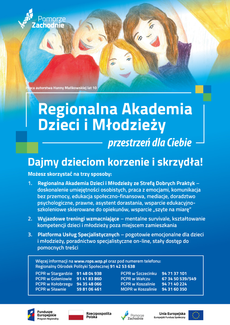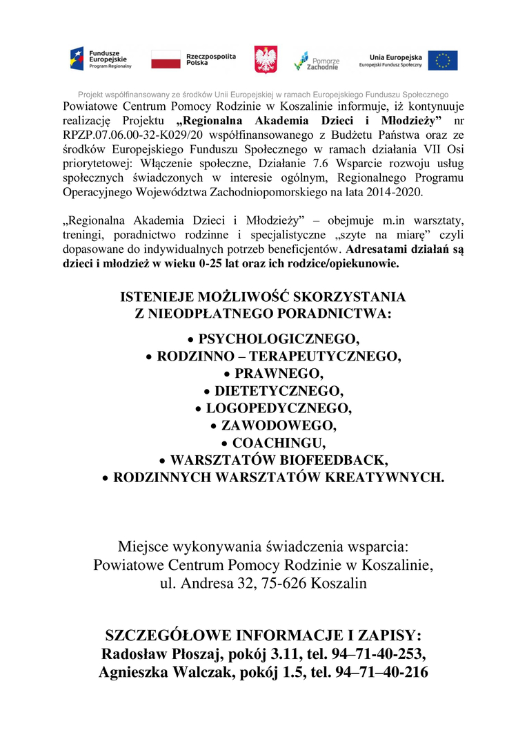 Powiatowe Centrum Pomocy Rodzinie w Koszalinie informuje, iż rozpoczęło realizację Projektu „Regionalna Akademia Dzieci i Młodzieży” nr RPZP.07.06.00-32-K029/20 współfinansowanego z Budżetu Państwa oraz ze środków Europejskiego Funduszu Społecznego w ramach działania VII Osi priorytetowej: Włączenie społeczne, Działanie 7.6 Wsparcie rozwoju usług społecznych świadczonych w interesie ogólnym, Regionalnego Programu Operacyjnego Województwa Zachodniopomorskiego na lata 2014-2020.