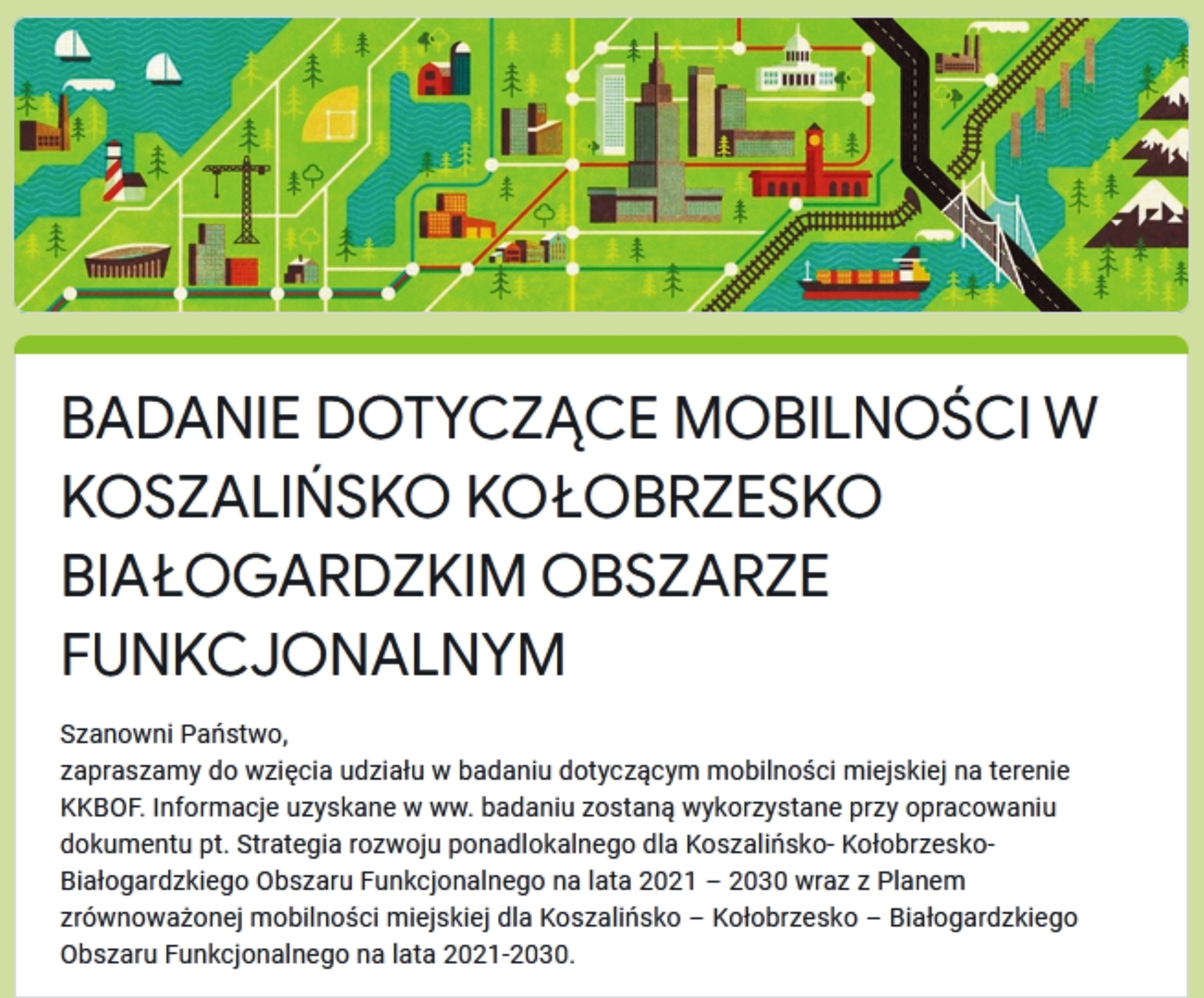 serdecznie zaprzsamy do udziału w badaniu dot. opracowania Strategii rozwoju ponadlokalnego dla Koszalińsko- Kołobrzesko-Białogardzkiego Obszaru Funkcjonalnego na lata 2021 – 2030 wraz z Planem zrównoważonej mobilności miejskiej dla Koszalińsko – Kołobrzesko – Białogardzkiego Obszaru Funkcjonalnego na lata 2021-2030
