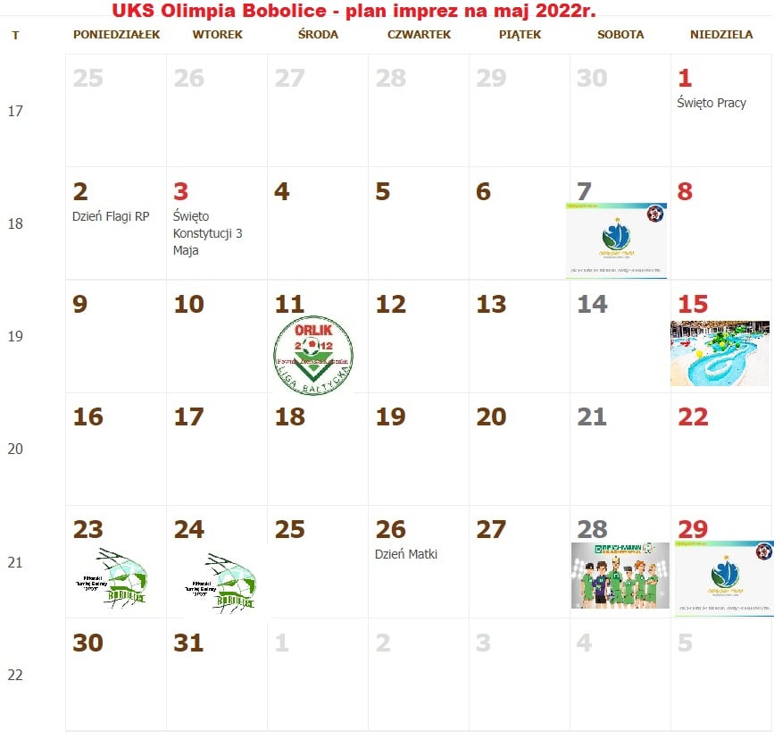 UKS Olimpia Bobolice przedstawia plan imprez na MAJ 2022 roku, który zawiera turnieje ligowe ZZPN „Pierwsza Piłka” Orlików i Żaków, turnieje Ligi Bałtyckiej Trampkarzy i Młodzików, Gminne Turnieje Piłkarskie „3PO3”, turniej Deichmanna Minimistrzostwa oraz wyjazd do Parku Wodnego Koszalin