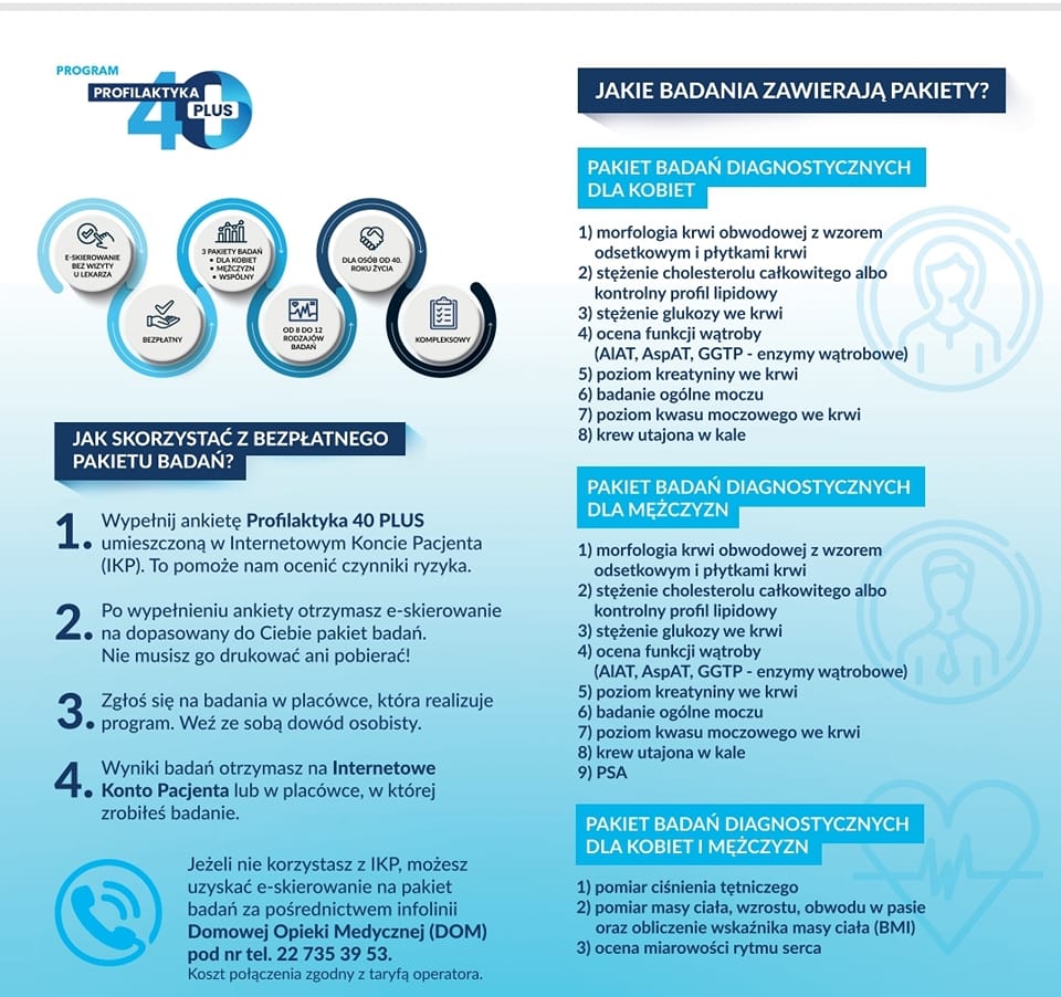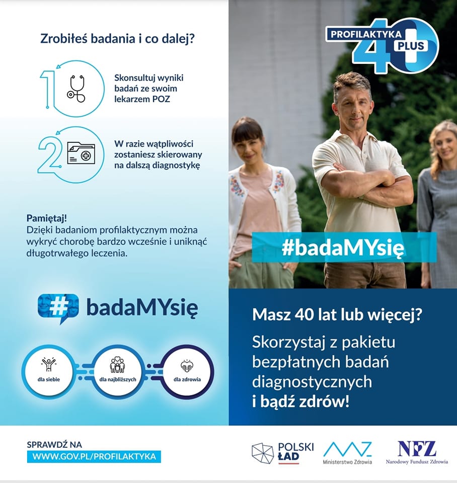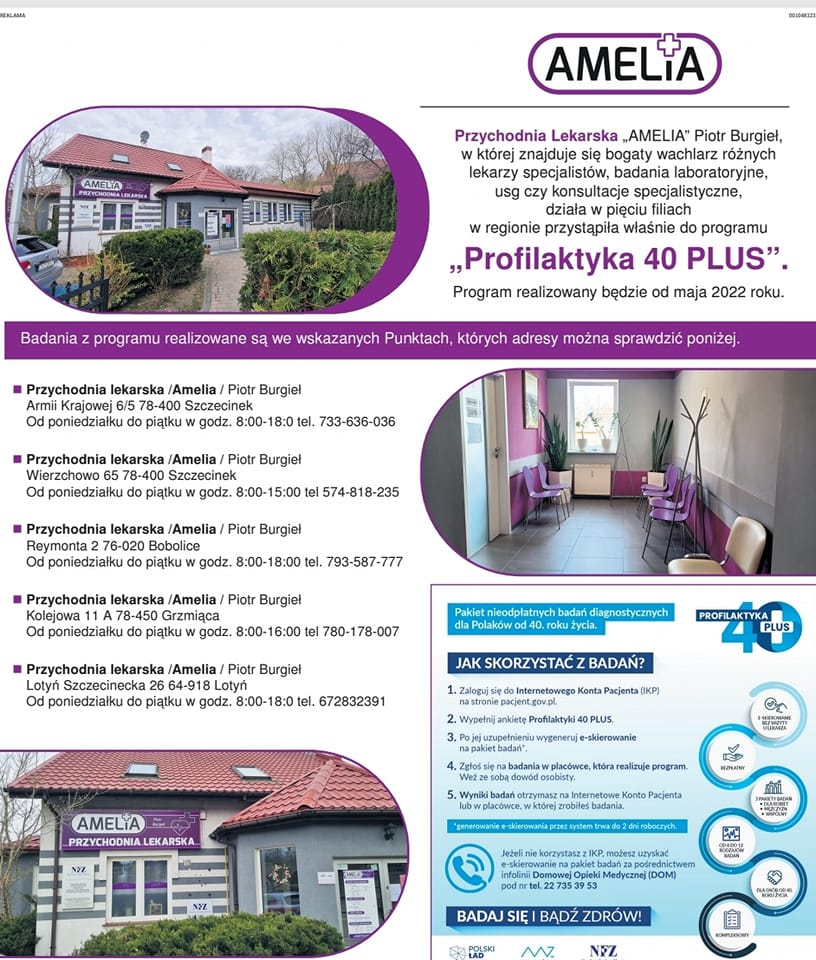 Przychodnia lekarska ,,AMELIA" serdecznie zaprasza do swoich oddziałów gdzie trwają zapisy na badania z programu 40 +. Chętne osoby zapraszamy do kontaktu telefonicznego pod numer telefonu: 793 587 777.