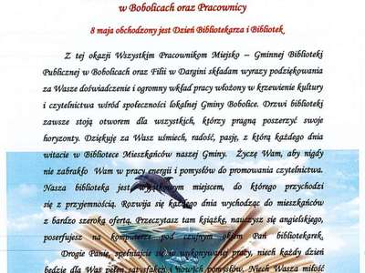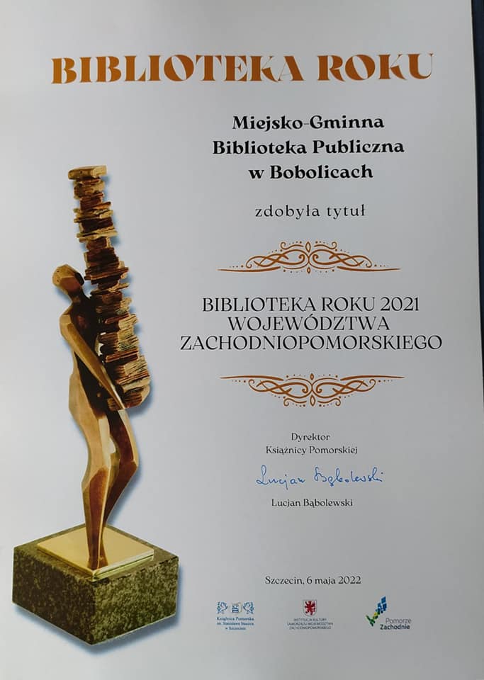 6 maja br. w Ksi膮偶nicy Pomorskiej w Szczecinie mia艂a miejsce wojewódzka inauguracja XVIII edycji Ogólnopolskiego Tygodnia Bibliotek, pod has艂em,,Biblioteka-艣wiat w jednym miejscu".Podczas inauguracji rozstrzygni臋to konkurs na najlepsz膮 bibliotek臋 województwa zachodniopomorskiego.Komisja Konkursowa jednog艂o艣nie przyzna艂a tytu艂 ,,Biblioteka Roku 2021" Miejsko-Gminnej Bibliotece Publicznej w Bobolicach. Tytu艂 ten przyznaje -Pan Lucjan B膮bolewski-Dyrektor Ksi膮偶nicy Pomorskiej w Szczecinie bibliotece, która osi膮gn臋艂a najlepsze wyniki w roku kalendarzowym w zakresie realizacji potrzeb czytelniczych, informacyjnych, edukacyjnych, kulturalnych i spo艂ecznych 艣rodowiska lokalnego.