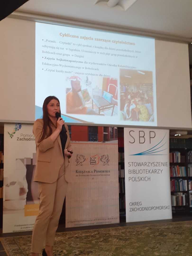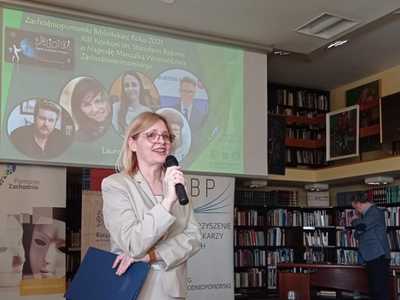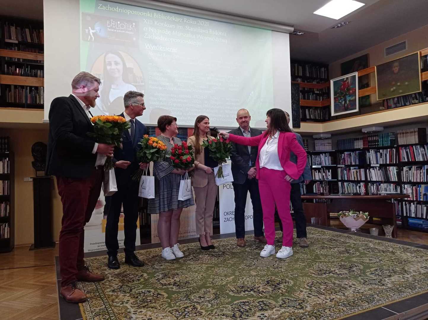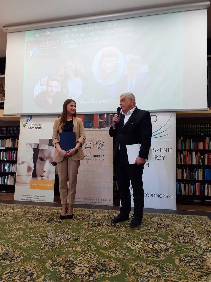 Ponadto w trakcie Inauguracji Tygodnia Bibliotek Pani Monika 呕emojtel– Dyrektor Biblioteki w Bobolicach otrzyma艂a wyró偶nienie w XIII edycji Konkursu im. Stanis艂awa Badonia ,,Bibliotekarz Roku 2021"o Nagrod臋 Marsza艂ka Województwa Zachodniopomorskiego.