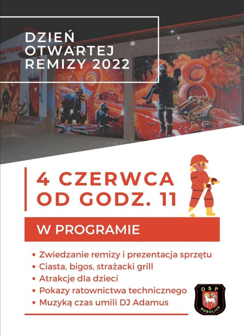 Strażacy z OSP Bobolice mają zaszczyt zaprosić na "Dzień Otwartej Remizy 2022", który odbędzie się 4 czerwca 2022r od godziny 11 przy ul. Warszawskiej 12A w Bobolicach.