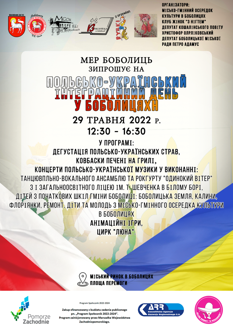 Burmistrz Bobolic wraz z organizatorami: Miejsko - Gminnym ośrodkiem Kultury w Bobolicach, Stowarzyszeniem ,,Klub Kobiet z Pazurem", Radnym Powiatowym Krzysztofem Orlikowskim, Radnym Rady Miejskiej w Bobolicach Piotrem Adamusem, Miejsko - Gminną Biblioteką Publiczną w Bobolicach oraz Kolami Gospodyń Wiejskich z Drzewian i z Kłanina serdecznie zapraszają na Integracyjny Dzień Polsko - Ukraiński w Bobolicach. W programie wiele atrakcji - potrawy Polsko - Ukraińskie, kiełbaski z grilla, koncerty muzyki Polskiej i Ukraińskiej, zabawy animacyjne i cyrk ,,LUNA".