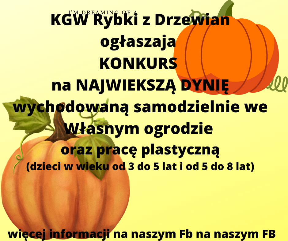 Koło Gospodyń Wiejskich ,,Rybki z Drzewian zapraszają wszystkich chętnych do udziału w konkursie na ,,NAJWIĘKSZĄ DYNIĘ" samodzielnie wyhodowaną oraz konkurs plastyczny dla dzieci, którego tematem przewodnim jest DYNIA (kategorie wiekowe od 3 do 5 lat i od 6 do 8 lat).
