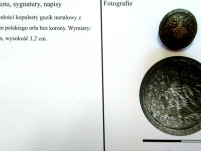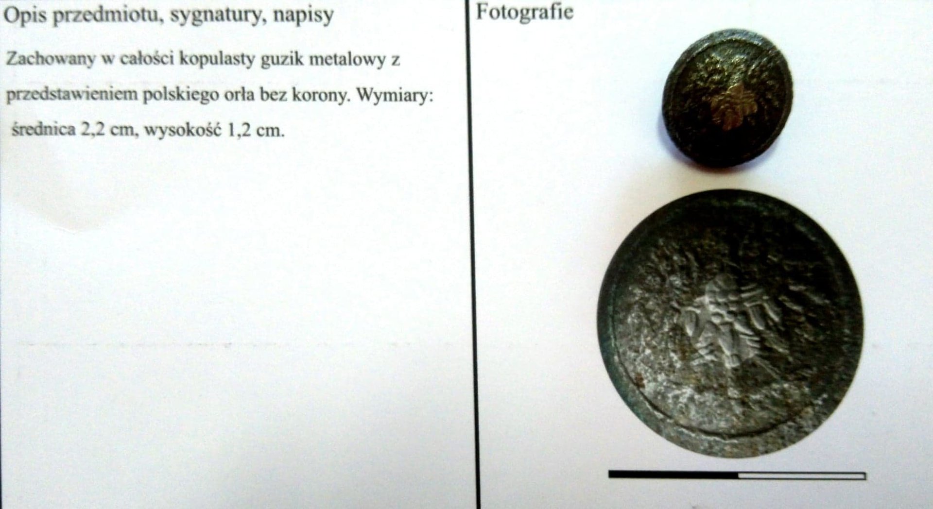 - zachowany w ca艂o艣ci kopulasty guzik metalowy z przedstawieniem polskiego or艂a bez korony;