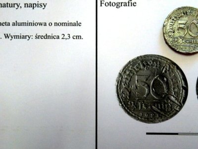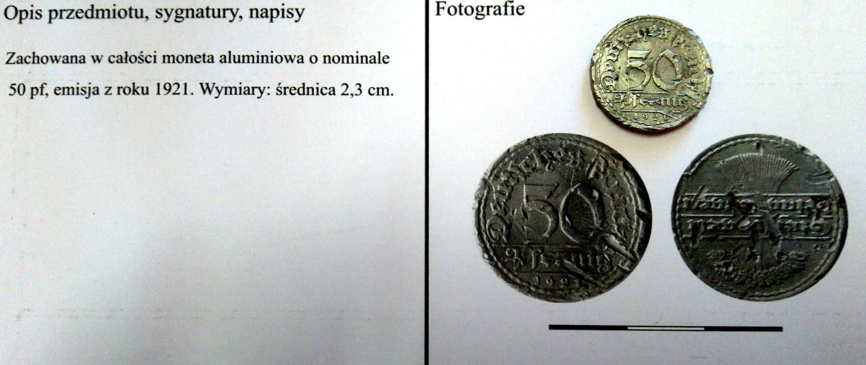 - zachowana w ca艂o艣ci moneta aluminiowa o nominale 50pf, emisja z roku 1921;