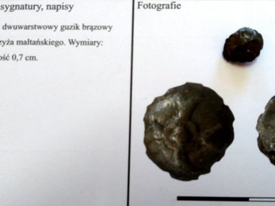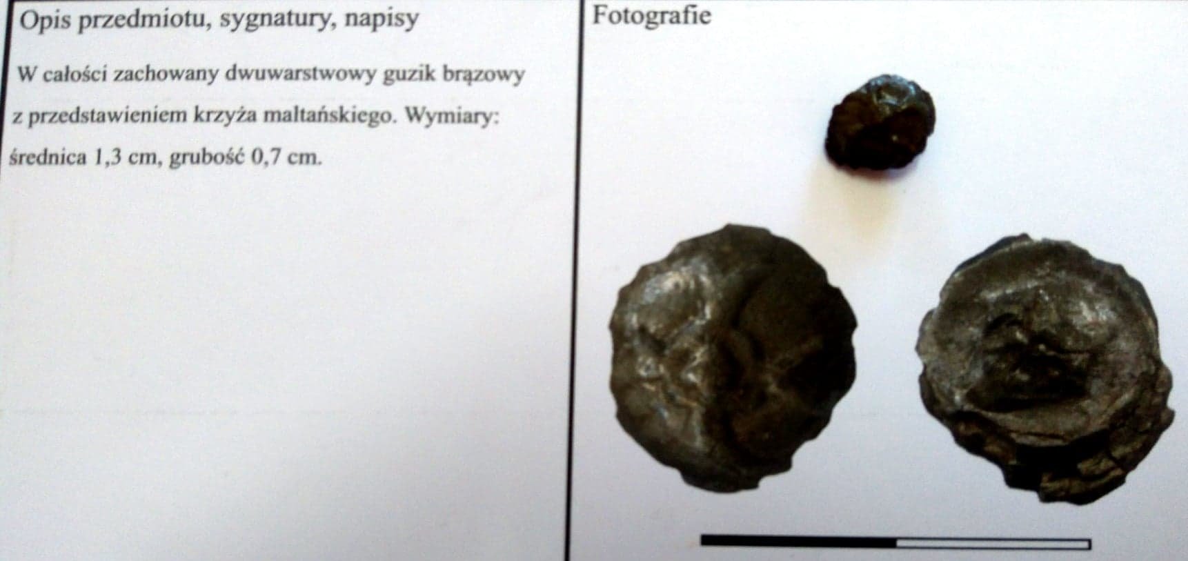 - w ca艂o艣ci zachowany dwuwarstwowy guzik br膮zowy z przedstawieniem krzy偶a malta艅skiego;