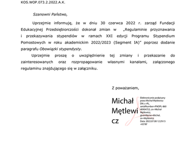 Uprzejmie informuję, że w dniu 30 czerwca 2022 r. zarząd Fundacji Edukacyjnej Przedsiębiorczości dokonał zmian w „Regulaminie przyznawania
