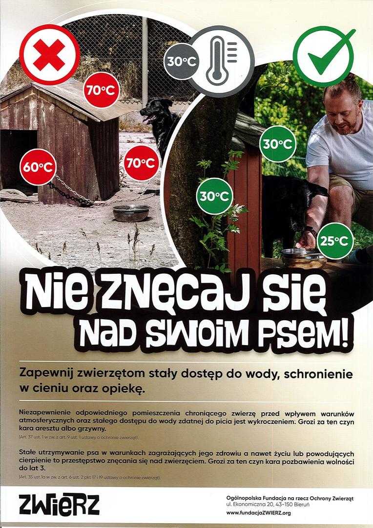 Odwodnienie, poparzenia, udar to tylko niektóre z zagrożeń, które wynikają z niewłaściwej opieki nad zwierzęciem latem. Szczególnie w trudnych warunkach są zwierzęta żyjące na uwięzi, pozostawione same sobie, często bez kropli wody zdatnej do picia. Buda, która stoi na otwartym słońcu i jest pokryta blachą nagrzewa się i temperatura w środku sięga nawet 70*C.