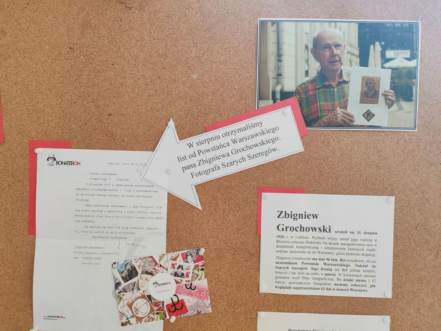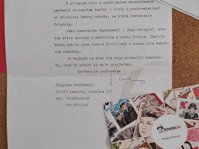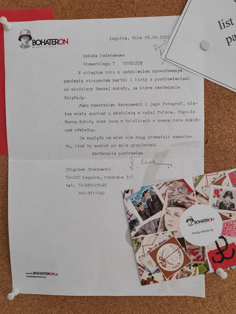 Miłą niespodzianką dla naszej szkoły jest dyplom od organizatorów za udział w akcji w tamtym roku oraz, a może przede wszystkim list napisany i przesłany przez Powstańca Warszawskiego pana Zbigniewa Grochowskiego.Pan Zbigniew podczas walk warszawskich wykonywał zdjęcia tamtych wydarzeń uwieczniając w kadrach walki powstańcze i ruiny stolicy. 96-letni dziś powstaniec warszawski jest ostatnim żyjącym fotografem powstania, który dokumentował okrucieństwa wojny i ogrom zniszczeń.