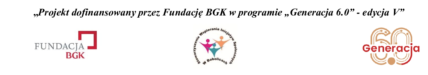 Stowarzyszenie Wspierania Inicjatyw Społecznych w Bobolicach pozyskało dofinansowanie w wysokości 15.000 zł z Fundacji BGK z Programu Generacja 6.0. Od stycznia 2023 r. do końca czerwca 2023 r. będziemy realizować projekt pt. „Pełni życia, pełni sił na 6.0 z plusem”. Głównym celem projektu jest aktywizacja mieszkańców gminy Bobolice w wieku 60+, przeciwdziałanie wykluczeniu społecznemu i technologicznemu oraz pobudzenie ich do aktywności społecznej, poprawy sprawności ruchowej i rozwoju zainteresowań kulturalnych.