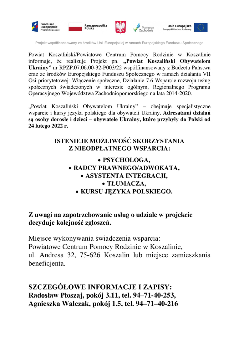 Powiat Koszaliński/Powiatowe Centrum Pomocy Rodzinie w Koszalinie informuje, że realizuje Projekt pn. „Powiat Koszaliński Obywatelom Ukrainy” nr RPZP.07.06.00-32-P003/22 współfinansowany z Budżetu Państwa oraz ze środków Europejskiego Funduszu Społecznego w ramach działania VII Osi priorytetowej: Włączenie społeczne, Działanie 7.6 Wsparcie rozwoju usług społecznych świadczonych w interesie ogólnym, Regionalnego Programu Operacyjnego Województwa Zachodniopomorskiego na lata 2014-2020.