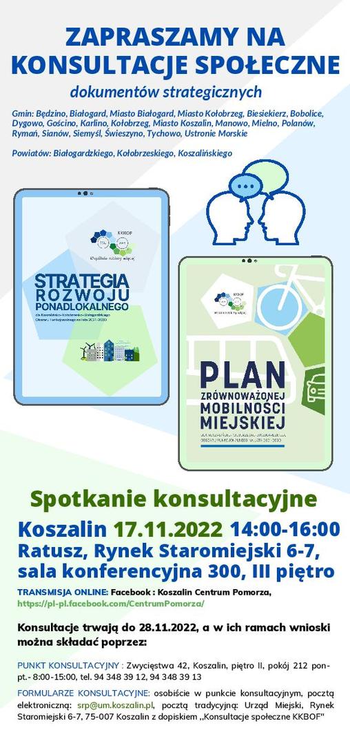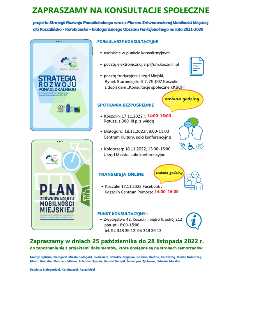 KONSULTACJE SPOŁECZNE - zmiana godzin konsultacji w Koszalinie - konsultacje Strategii Rozwoju Ponadlokalnego 2021-2030 oraz Planu Zrównoważonej Mobilności Miejskiej 2021-2030 dla KKBOF