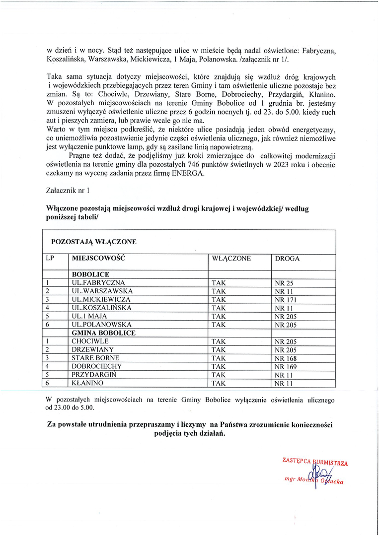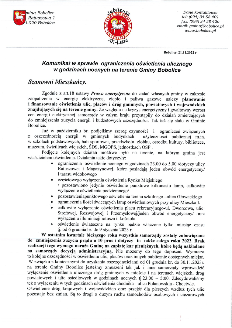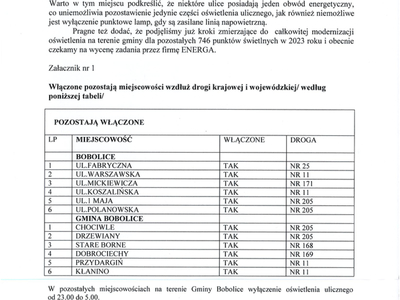 W związku z koniecznymi do uzyskania oszczędnościami od 01 grudnia br. do 30.11.2023 r. na terenie Gminy Bobolice jesteśmy zmuszeni tak jak i inne samorządy wprowadzić wyłączenie oświetlenia ulicznego dróg gminnych w mieście i na terenach wiejskch, dróg powiatowych i ulic osiedlowych w godzinach nocnych tj.23:00 – 5:00. Zdecydowaliśmy też o wyłączeniu w tych godzinach oświetlenia chodnika - ulica Polanowska - Chociwle.