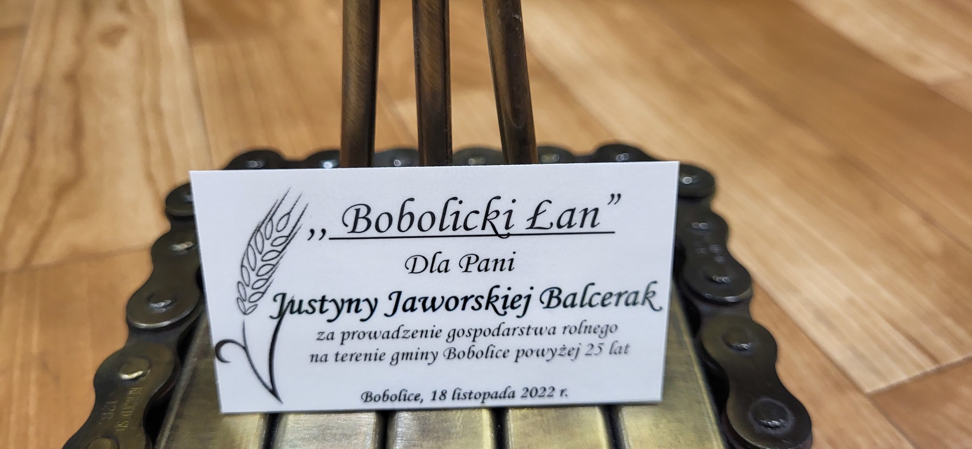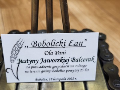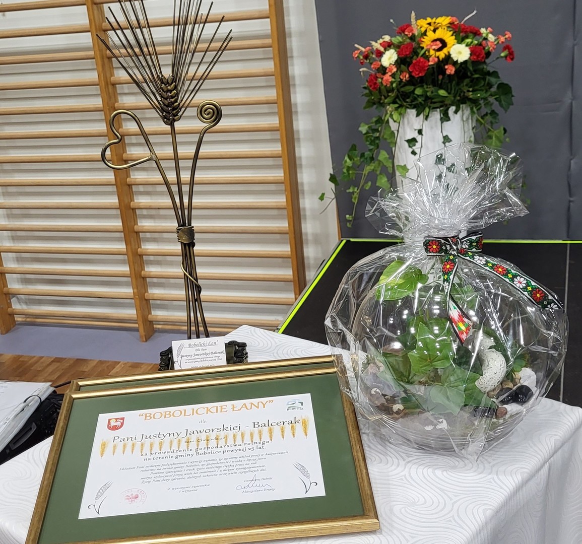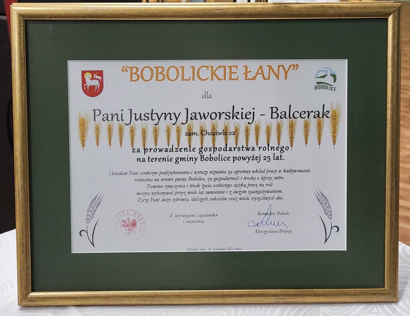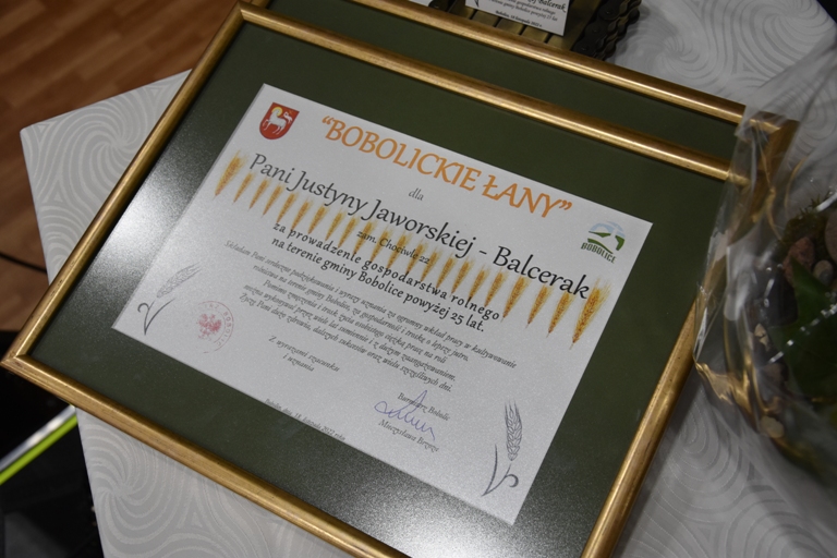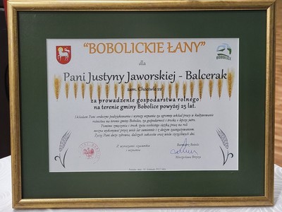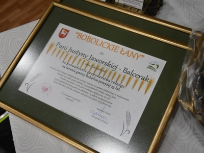 Podczas obrzędów Burmistrz wraz z Przewodniczącym Rady Miejskiej wręczyli nagrodę „Bobolickiego Łana” dla Pani Justyny Jaworskiej - za prowadzenie gospodarstwa rolnego na terenie gminy Bobolice powyżej 25 lat.
