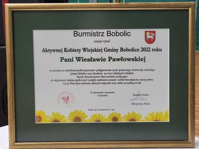 Przyznany został tytuł „Aktywnej Kobiety Wiejskiej Gminy Bobolice”, a jego laureatką została Pani Wiesława Pawłowska - Sołtys sołectwa Stare Borne. Nagrodę wręczyła Burmistrz wraz z Wicestarostą Koszalińskim.