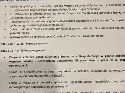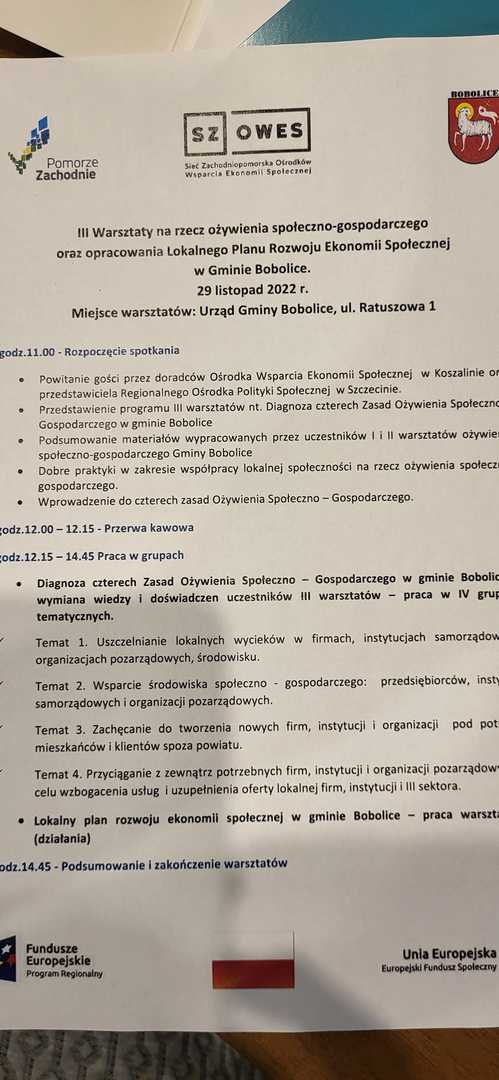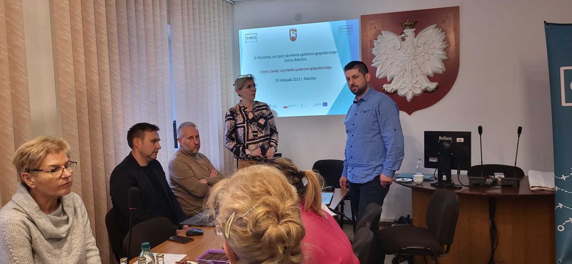 W Urzędzie Miejskim w Bobolicach trwają III Warsztaty na rzecz ożywienia społeczno - gospodarczego oraz opracowanie Lokalnego Planu Rozwoju Ekonomii Społecznej w Gminie Bobolice. Spotkanie prowadzą przedstawiciele OWES Koszalin i Regionalny Ośrodek Polityki Społecznej UM WZ w Szczecinie. W spotkaniu wzięli przedstawiciele instytucji i placówek, organizacji pozarządowych z terenu Gminy Bobolice. Głównym celem spotkania było podjęcie na terenie Gminy Bobolice ożywienia społeczno-gospodarczego, aktywizacja rynku pracy oraz opracowanie Lokalnego Planu Rozwoju Ekonomii Społecznej w Gminie Bobolice. Spotkanie było okazją do zaktualizowania potrzeb w gminie, rozpoznanie zasobów i możliwości współpracy partnerskiej w obszarze ekonomii społecznej, w tym zakresie realizacji klauzul społecznych i usług społecznych. Poprzez spotkania chcemy zainicjować proces tworzenia lokalnego rozwoju Ekonomii Społecznej z uwzględnieniem stosowanych zapisów Krajowego Programu Rozwoju Ekonomii Społecznej, Krajowego Programu Przeciwdziałania Ubóstwu i Wykluczeniu Społecznemu oraz Ustawy o Ekonomii Społecznej i Solidarnej.