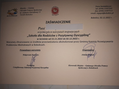 Mając na względzie dobro rodziny Miejsko – Gminny Ośrodek Pomocy Społecznej w Bobolicach zorganizował warsztaty terapeutyczne „Szkoła dla Rodziców z Pozytywną Dyscypliną”. Szkolenie obejmowało cykl sześciu spotkań, w których czynnie uczestniczyło 12 osób, mieszkańców gminy Bobolice. Głównym celem przeprowadzonych zajęć było nabycie przez rodziców niezbędnych umiejętności do pracy z dzieckiem, dostarczenie rodzicom gotowych narzędzi i technik pomocnych w procesie wychowawczym oraz takie modelowanie zachowań rodziców aby rodzicielstwo stało się źródłem radości a nie tylko trosk. Na zakończenie rodzice otrzymali zaświadczenie potwierdzające uczestnictwow w/w warsztatach.