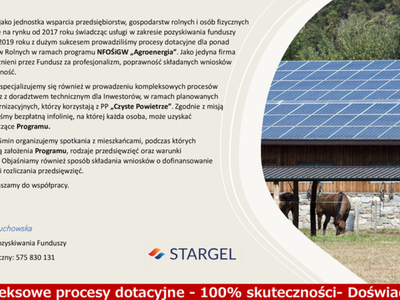 Firma STARGEL jako jednostka wsparcia przedsiębiorstw, gospodarstw rolnych i osób fizycznych działa skutecznie na rynku od 2017 roku świadcząc usługi w zakresie pozyskiwania funduszy dotacyjnych. W 2019 roku z dużym sukcesemprowadziliśmy procesy dotacyjne dla ponad 200 Gospodarstw Rolnych w ramach programu NFOŚiGW „Agroenergia”. Jako jedyna firma zostaliśmy wyróżnieni przez Fundusz za profesjonalizm, poprawność składanych wniosków i wysoką skuteczność.