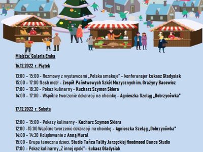 Bożonarodzeniowy Jarmark w Emce to jedyny taki jarmark jaki odbędzie się w tym roku w Koszalinie. Poza możliwością zakupu bożonarodzeniowych ozdób i przetworów będzie można posłuchać kolęd, wziąć udział w pokazach kulinarnych, warsztatach rękodzielniczych, obejrzeć pokazy taneczne i wziąć udział w spektaklu lalkowym.